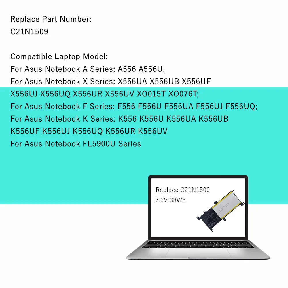 Comprar 7,6 V 38wh batería del ordenador portátil para For Asus Notebook A556 X556UA F556 F556U F556UA F556UJ F556UQ X556UB X556UF X556UJ A556U C21N1509