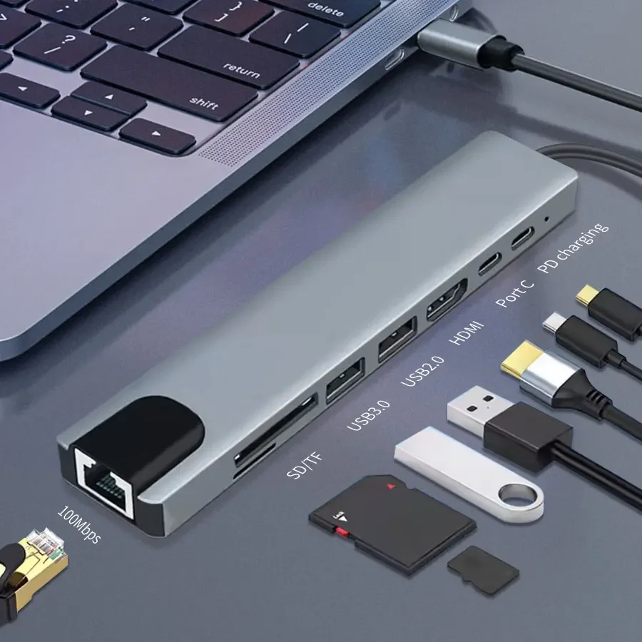 • Adaptador 8 en 1 tipo C:Este adaptador puede convertir USB tipo C a HDMI, USB 3.0 y RJ45, lo que lo hace versátil y conveniente para varios dispositivos.