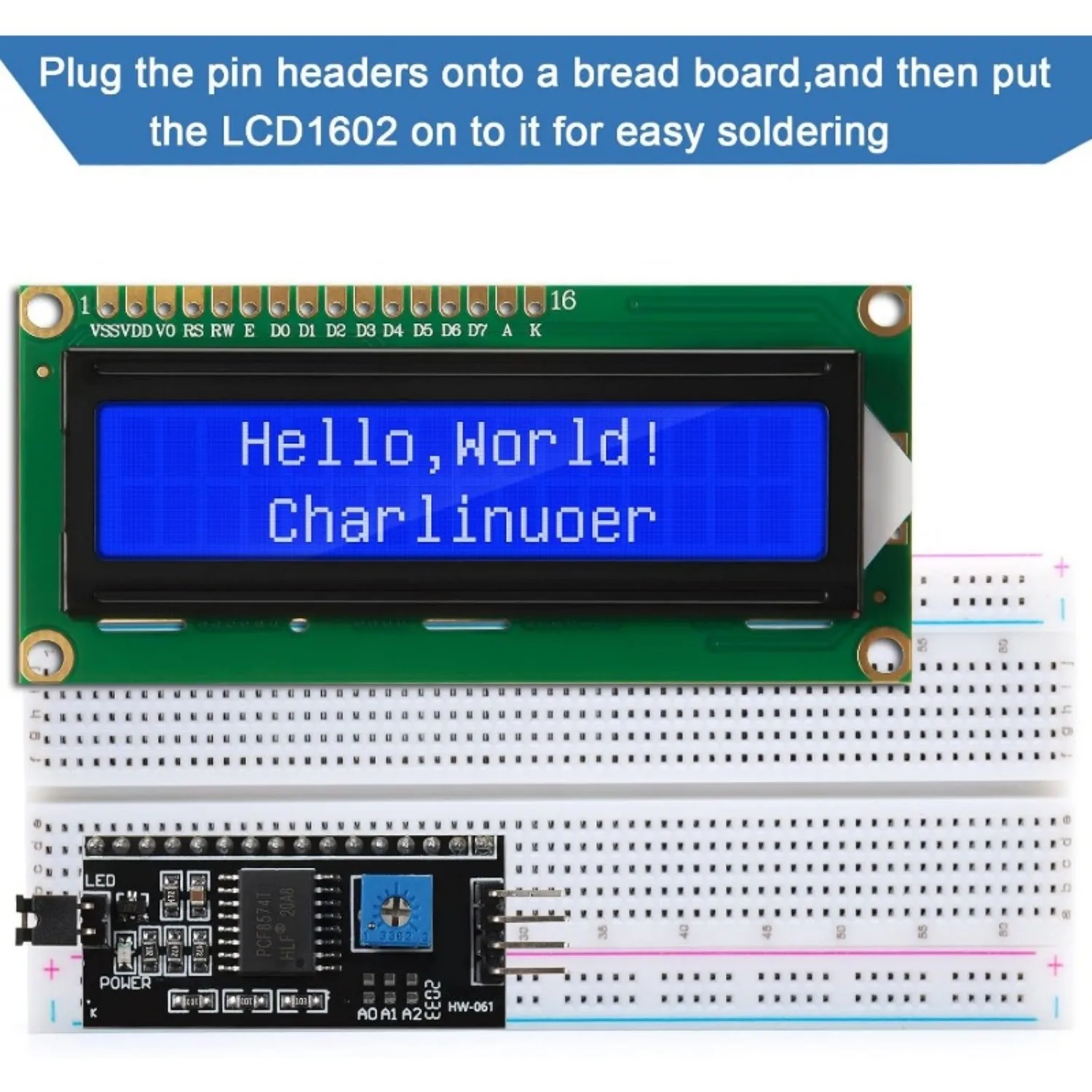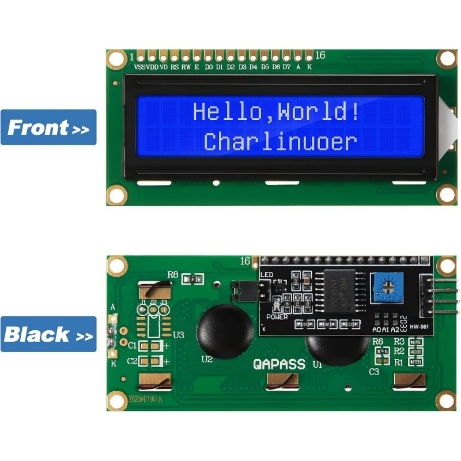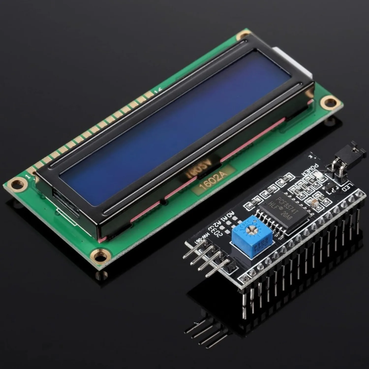 Componentes: Pantalla LCD con mochila de interfaz serie i2c; La pantalla LCD puede mostrar 2 líneas x 16 caracteres; El adaptador LCD i2c integrado en un controlador LCD equivalente estándar de la industria