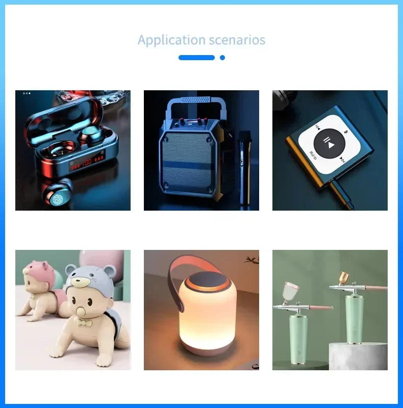 Es ampliamente utilizado en walkie-talkie, PSP, juguetes eléctricos, MP5, GPS, control remoto, iPod, tabletas, altavoces Bluetooth, auriculares, cámaras, MID, máquinas POS, lámparas solares y otros dispositivos con el mismo tamaño y capacidad de batería..