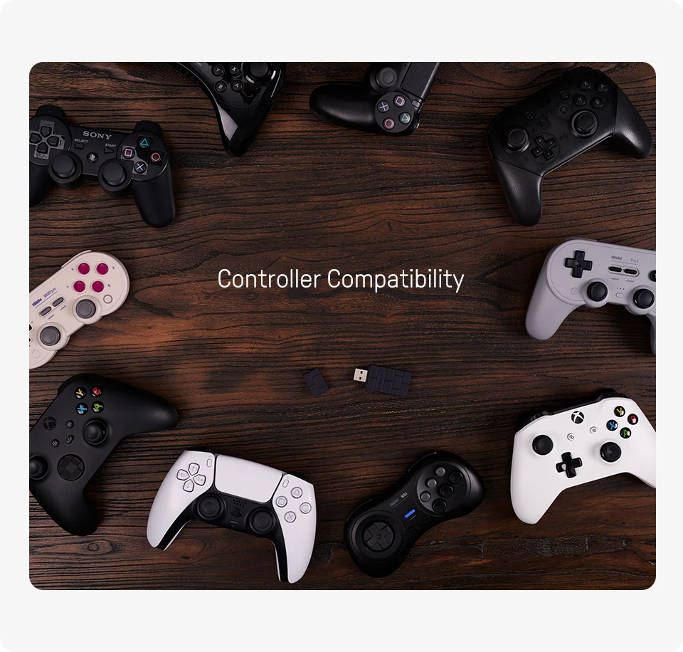 DualSense, DualShock 4, controlador Dualshock 3, Xbox Series X&S, controlador Bluetooth Xbox One, Switch Pro, Switch Joy-Con, Wii U Pro, control remoto Wii, controladores 8BitDo y palos arcade.