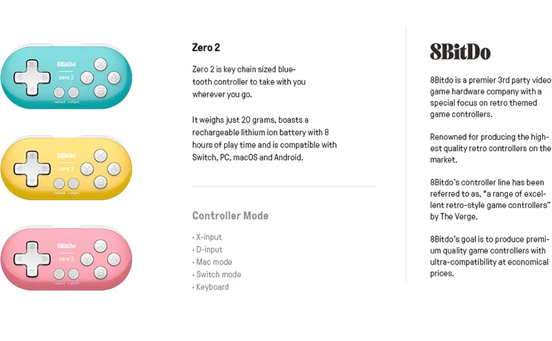 8BitDo Zero 2 Bluetooth Gamepad para Nintendo Switch Windows Android macOS Controlador de juego inalámbrico Bluetooth para NS Switch