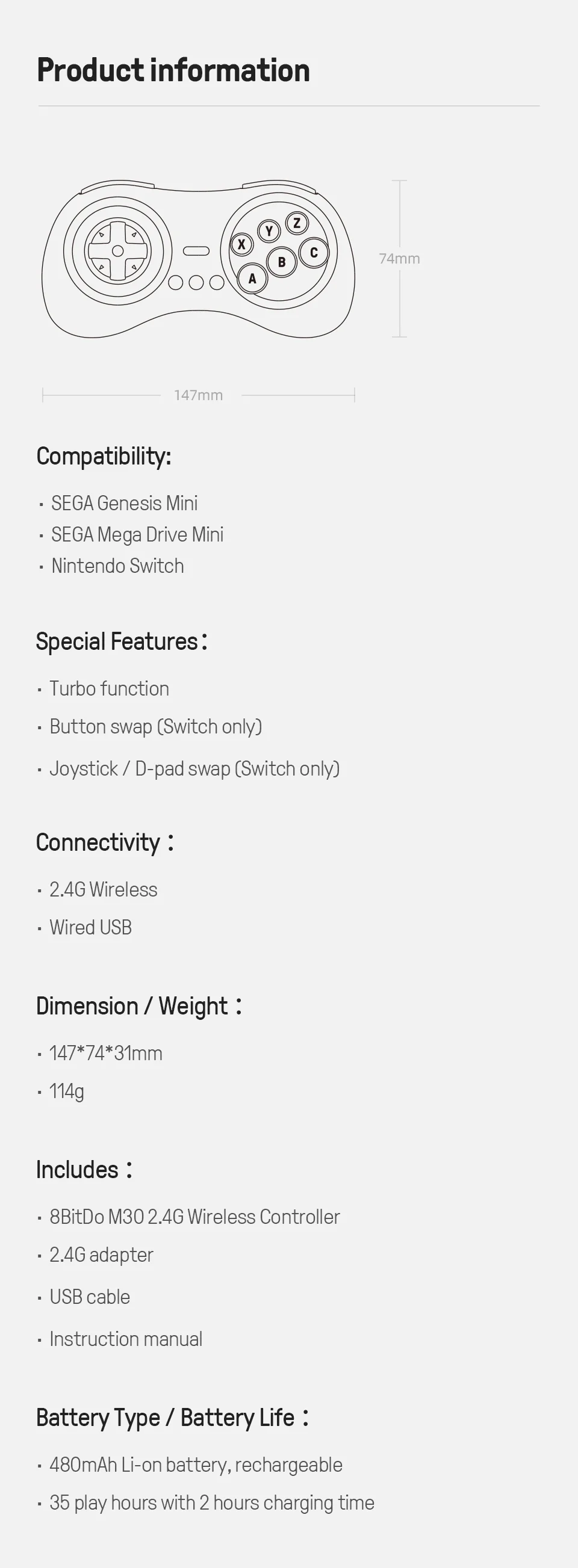 Con su agarre corto y en forma de Guijarro, El 8BitDo M30 proporciona un mejor manejo. El Mapeo de funcionalidad Turbo Añadido mejora el control.