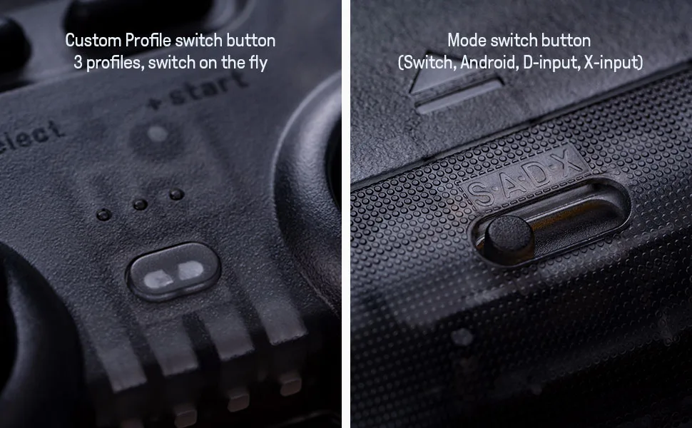 The new 4-way Mode Switch button allows you to instantly switch between Switch(S), Mac OS(A), D-input(D) and X-input(X) so you can pair to any device as easily as possible.