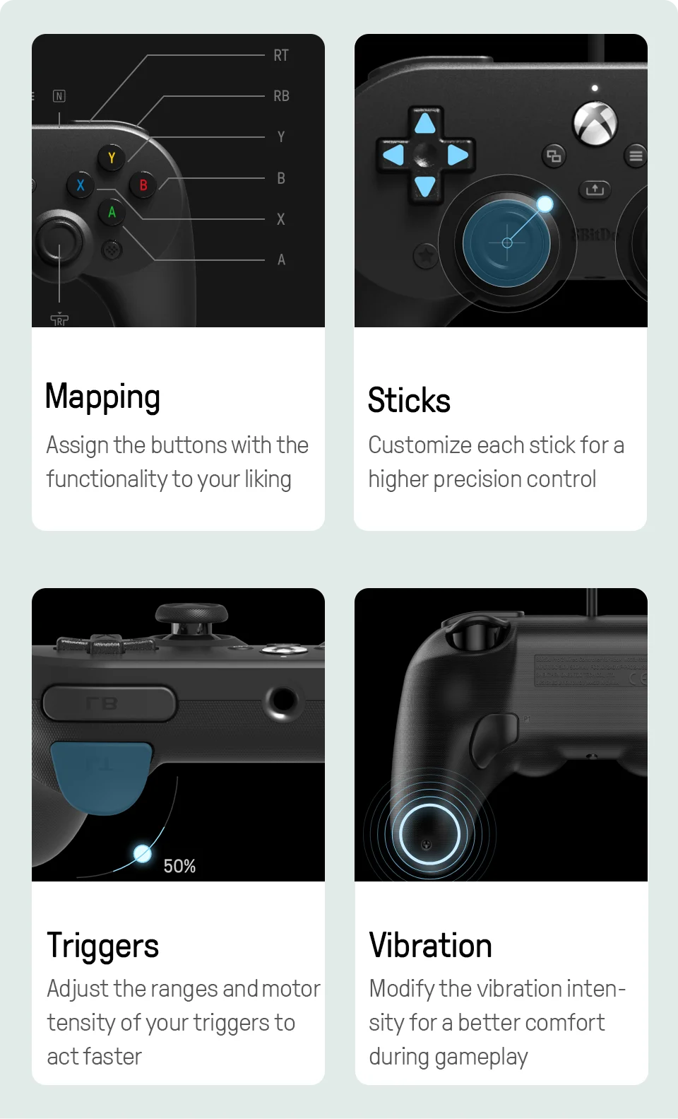 Pro 2 Xbox Wried cuenta con dos botones traseros de nivel profesional. Estos botones le dan más control para que no tenga que quitar los pulgares de los pulgares. Con 8BitDo final Software que puede asignar cualquier botón de función y macros también