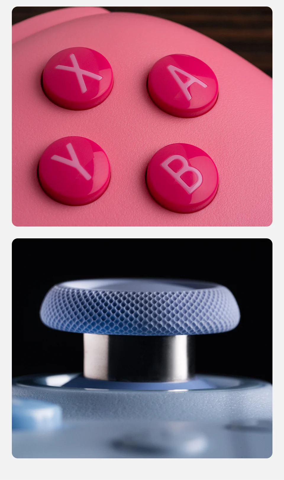 Mapeo rápido de botones. Anillos de joystick de metal resistentes al desgaste. Botones ABXY refinados.