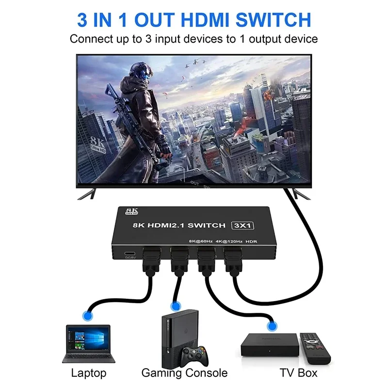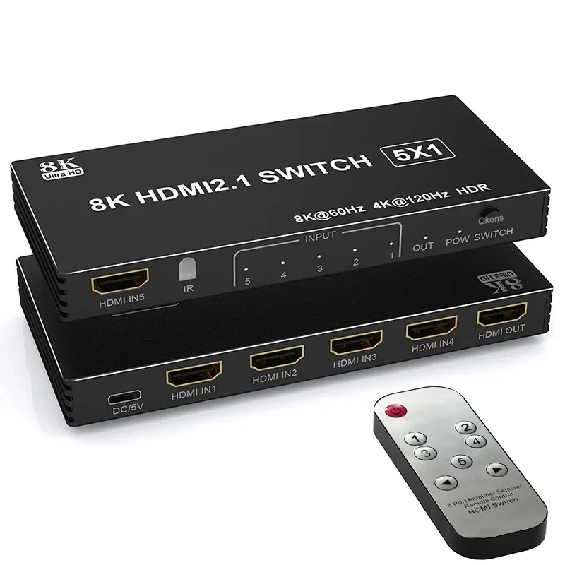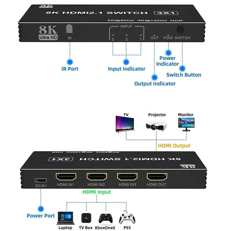 This HDMI Switcher with IR remote control supports 8K@60Hz,4K@120Hz,2K@144Hz, IR Control, HDR,