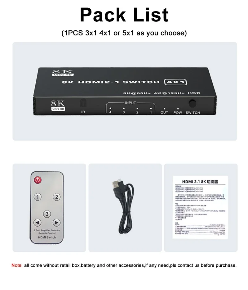 1x 8K HDMI 2.1 Switch ( 5x1 or 4x1 or 3x1 as you bought )