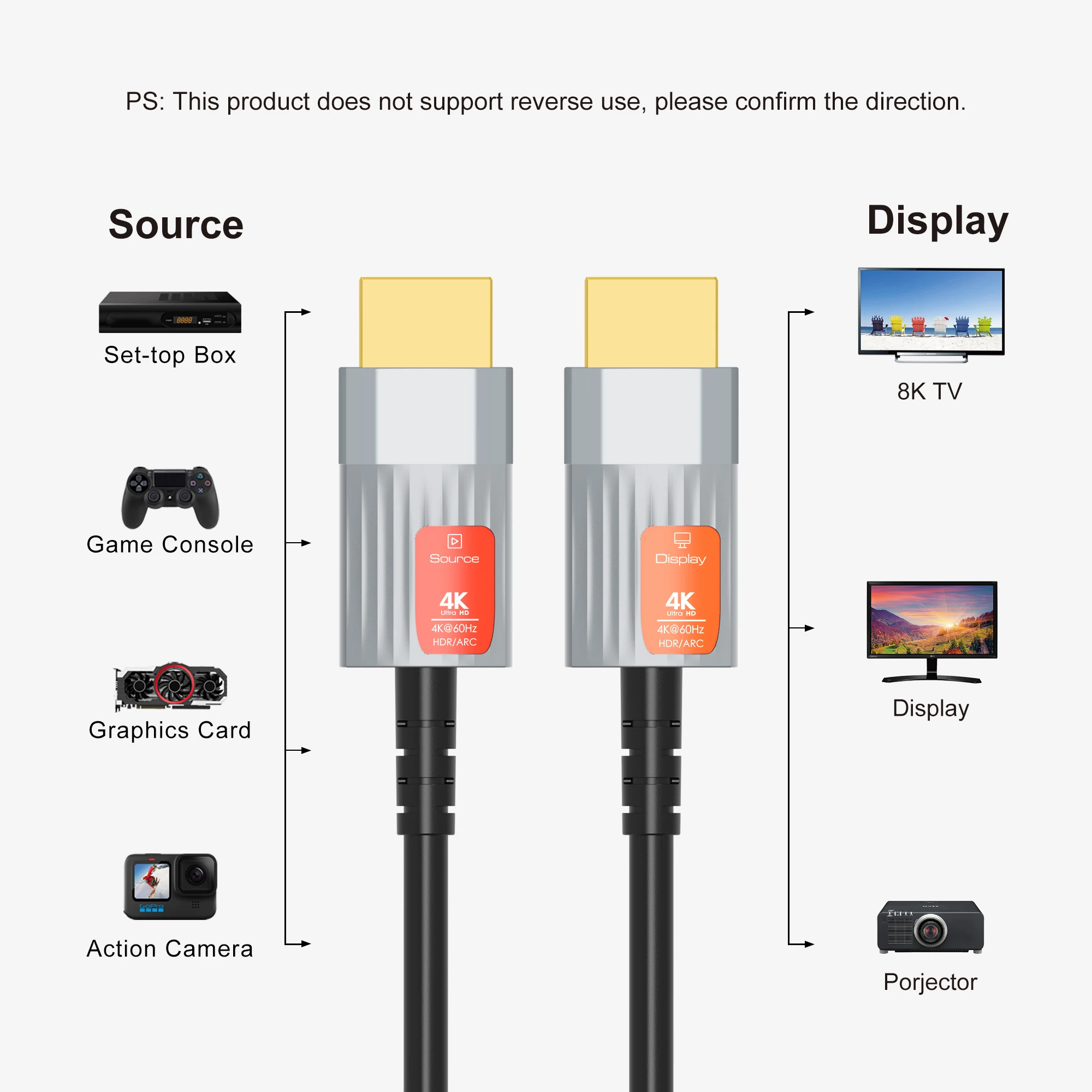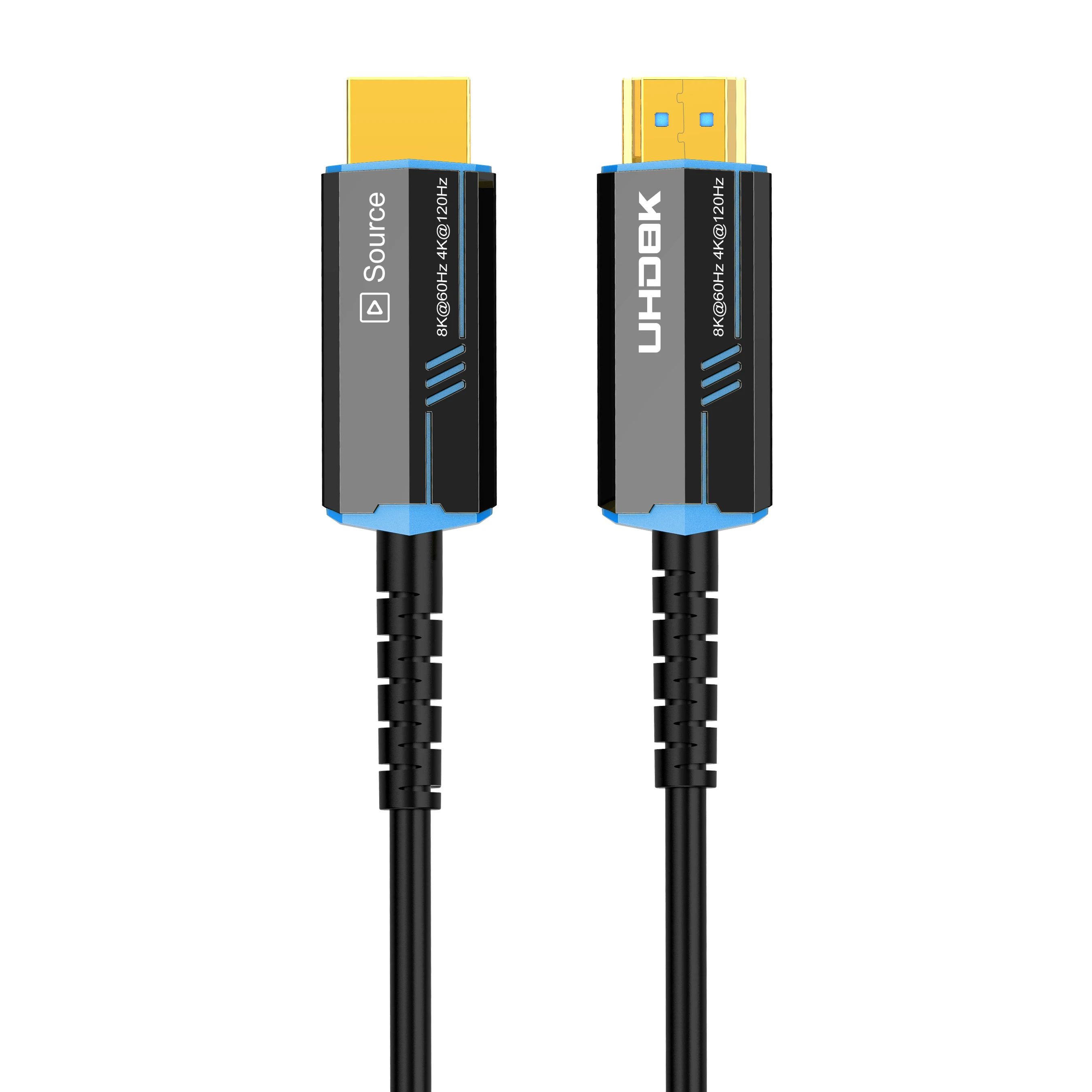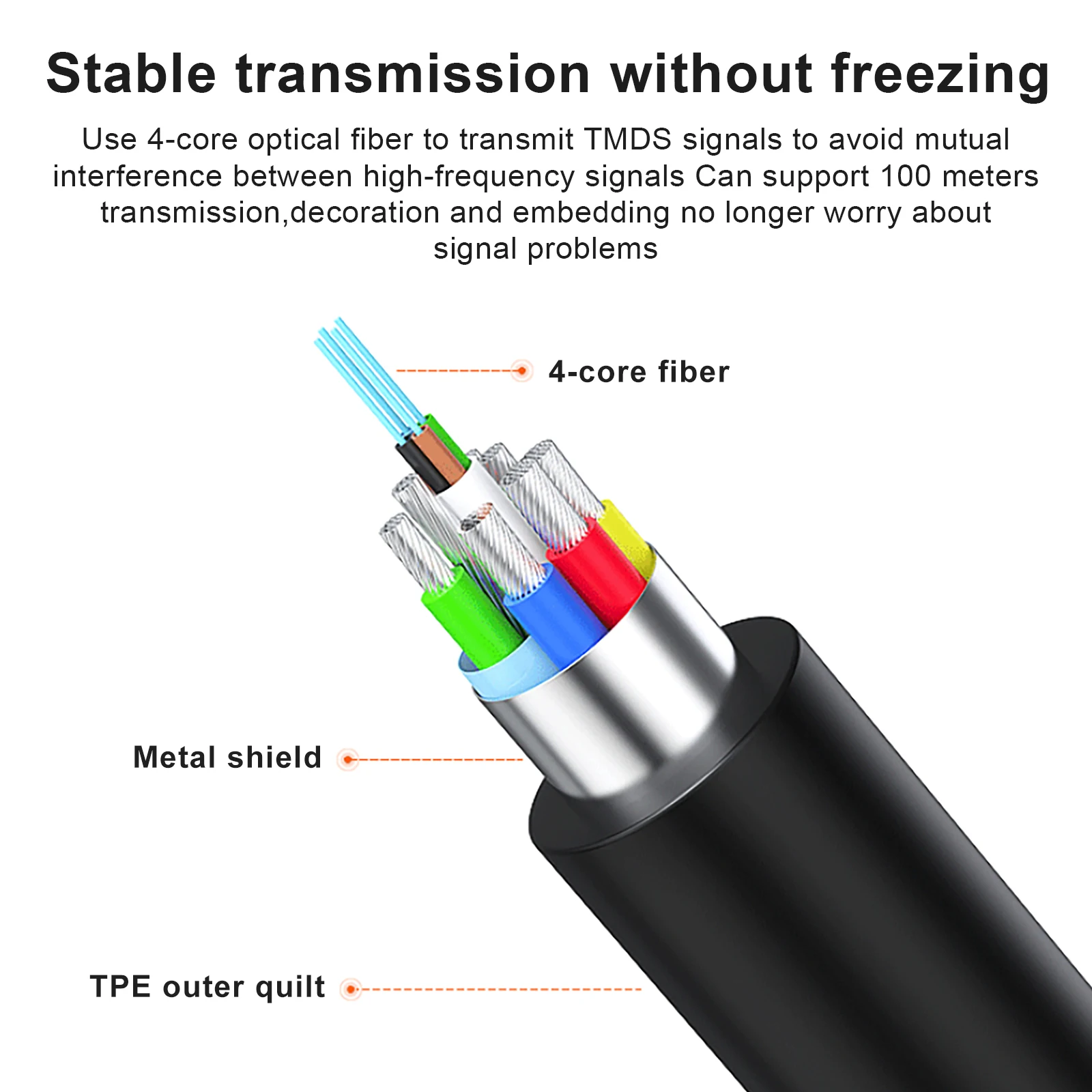 Cable HDMI de fibra óptica de 8K: Realiza transmisión de audio y vídeo de ultra larga distancia, sin compresión de señal, sin demoras en la transmisión de velocidad de la luz, sin interferencias electromagnéticas y sin radiación.Es compatible con 8K@60HZ y 4K@120HZ.