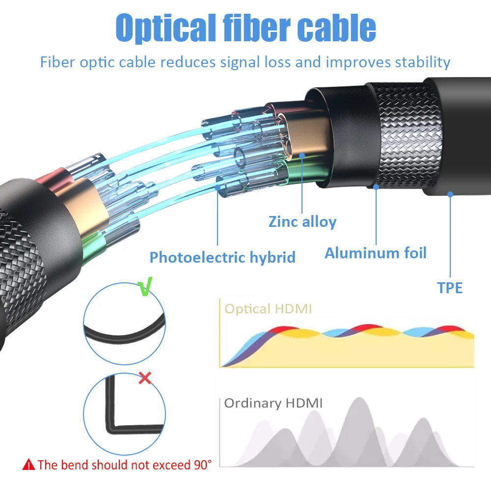 Cable HDMI de fibra óptica de 8K: Realiza transmisión de audio y vídeo de ultra larga distancia, sin compresión de señal, sin demoras en la transmisión de velocidad de la luz, sin interferencias electromagnéticas y sin radiación.Es compatible con 8K@60HZ y 4K@120HZ.