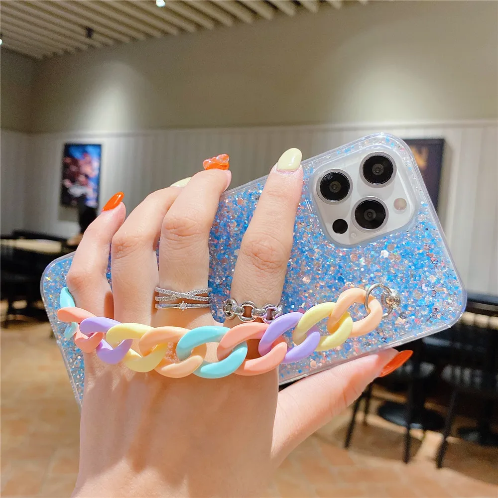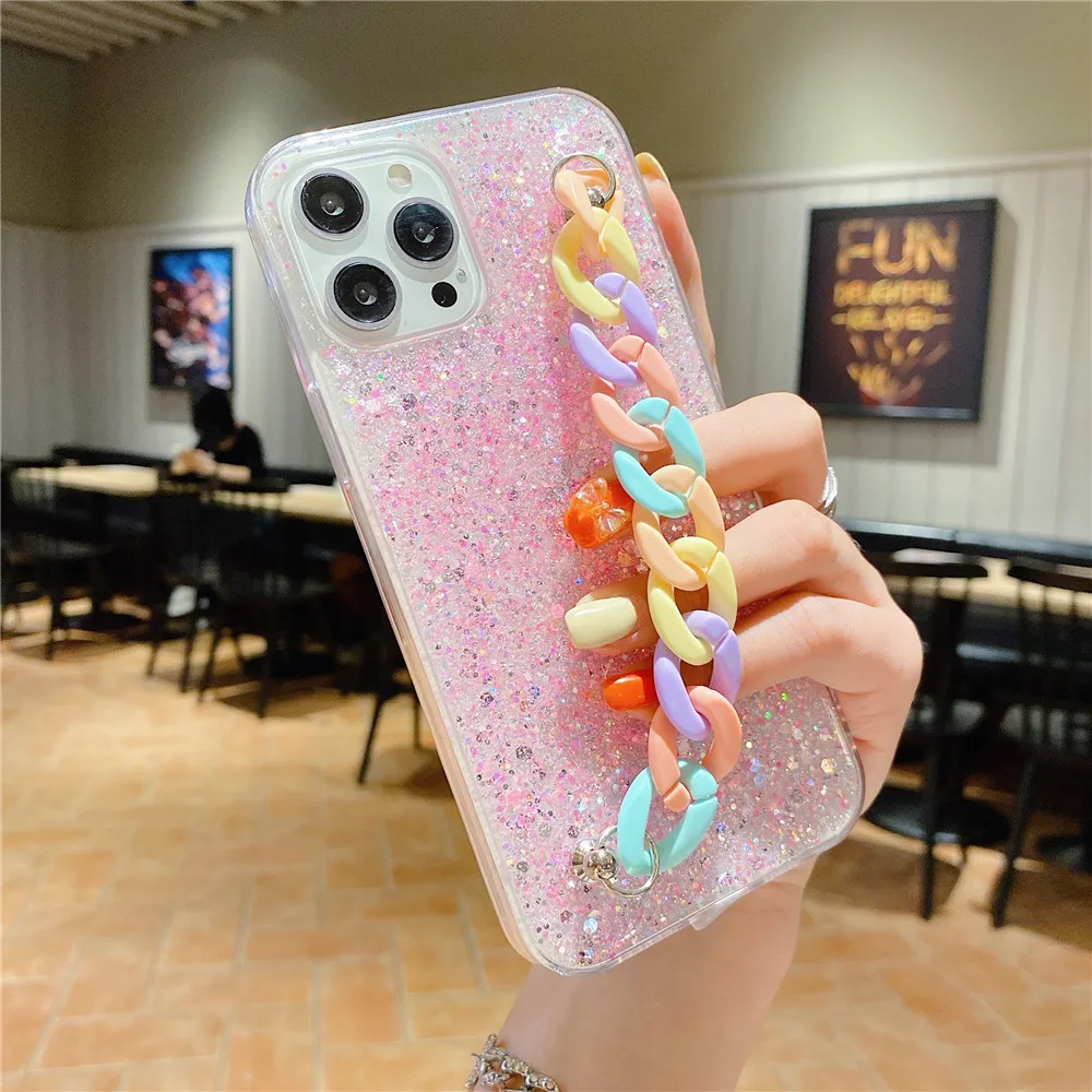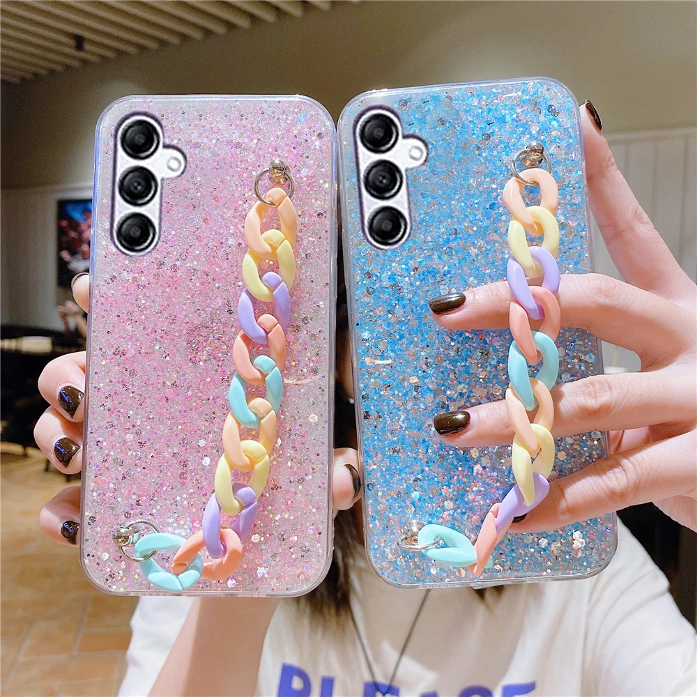 Funda con purpurina de cadena de muñeca de Color caramelo A 54 34 14 para Samsung A54 A34 A14 A24 A25 A35 A55 A13 A23 A33 A53 A52 A32