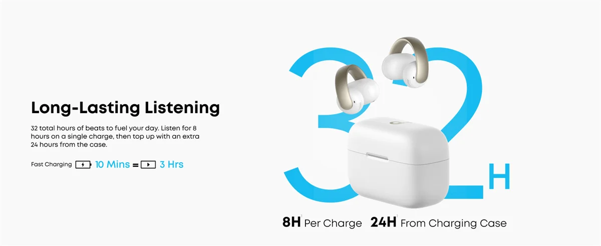 5.Batería de larga duración: hasta 8 horas de reproducción con una sola carga con 24 horas adicionales desde el estuche de carga, hasta 32 horas de reproducción total.