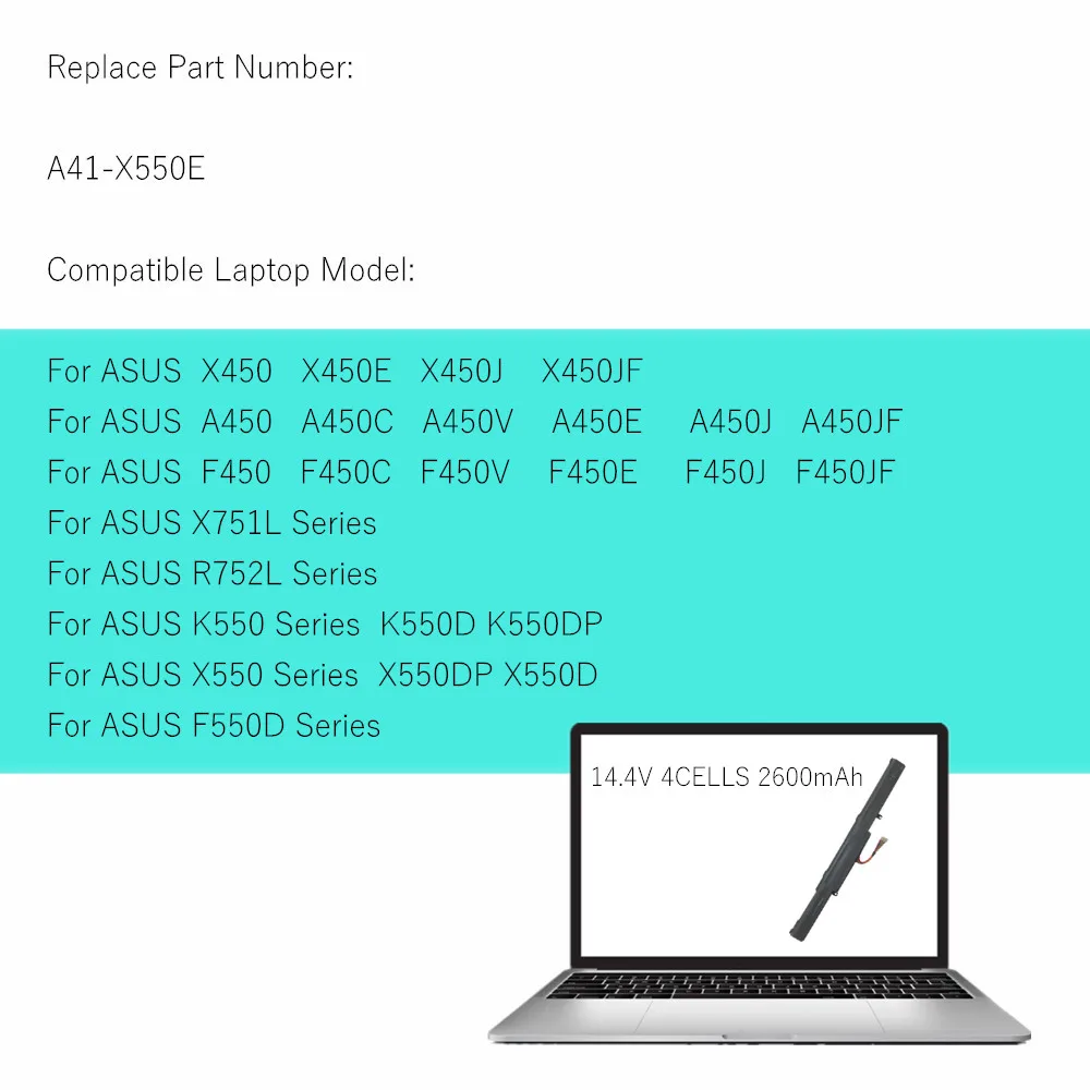 A41-X550E de batería del ordenador portátil para For Asus A450V K550E X750J A550D K751L X751L F450 P750LB X751MA F450C R752L X751MD F450E R752MA X751MJ