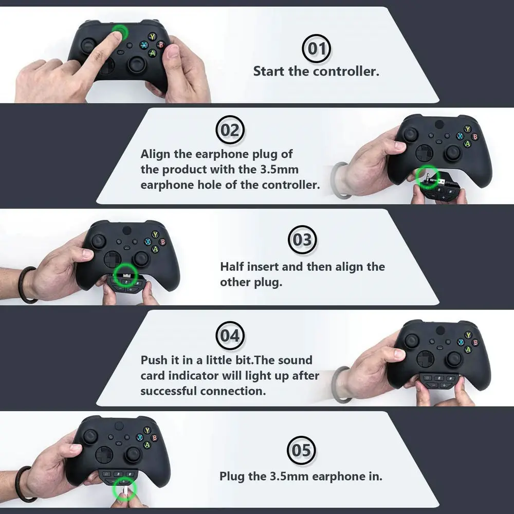 Conecte los auriculares de 3,5mm al conector de auriculares en la parte inferior de la tarjeta de sonido X1 e inicie el joypad para que funcione normalmente.