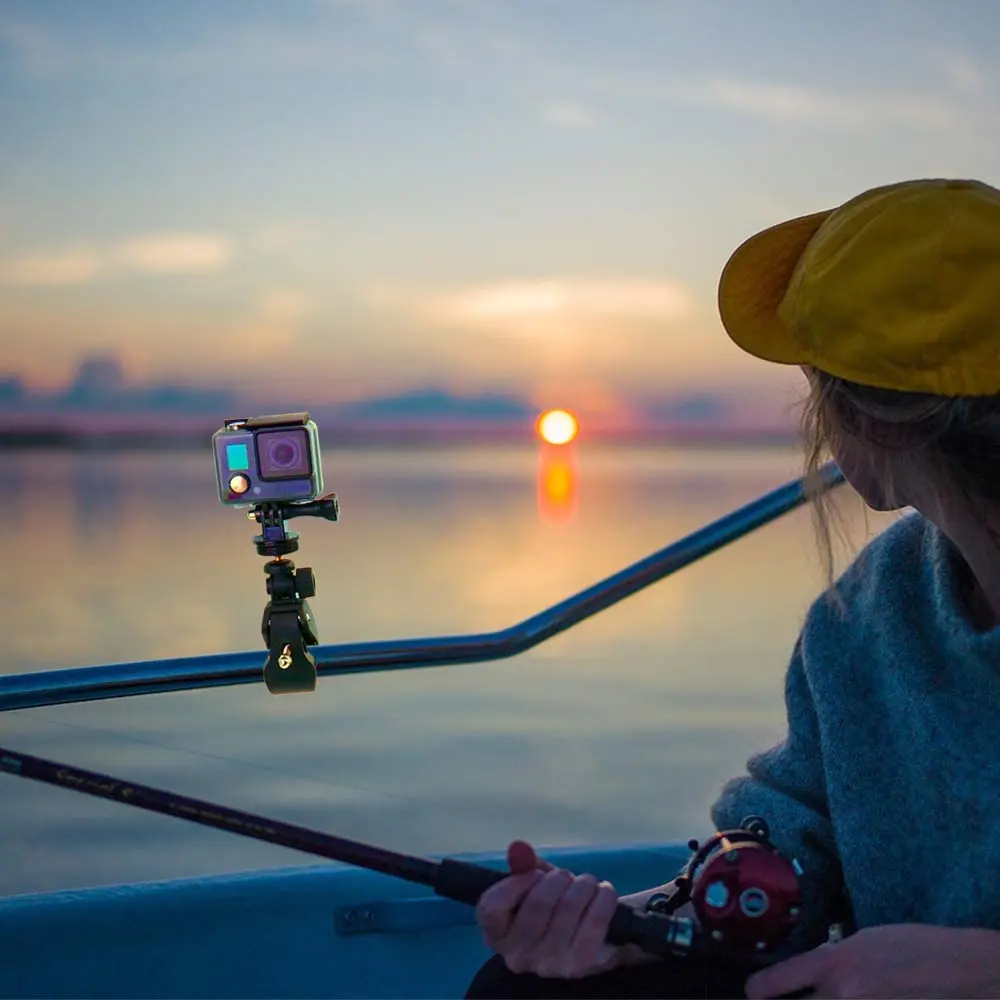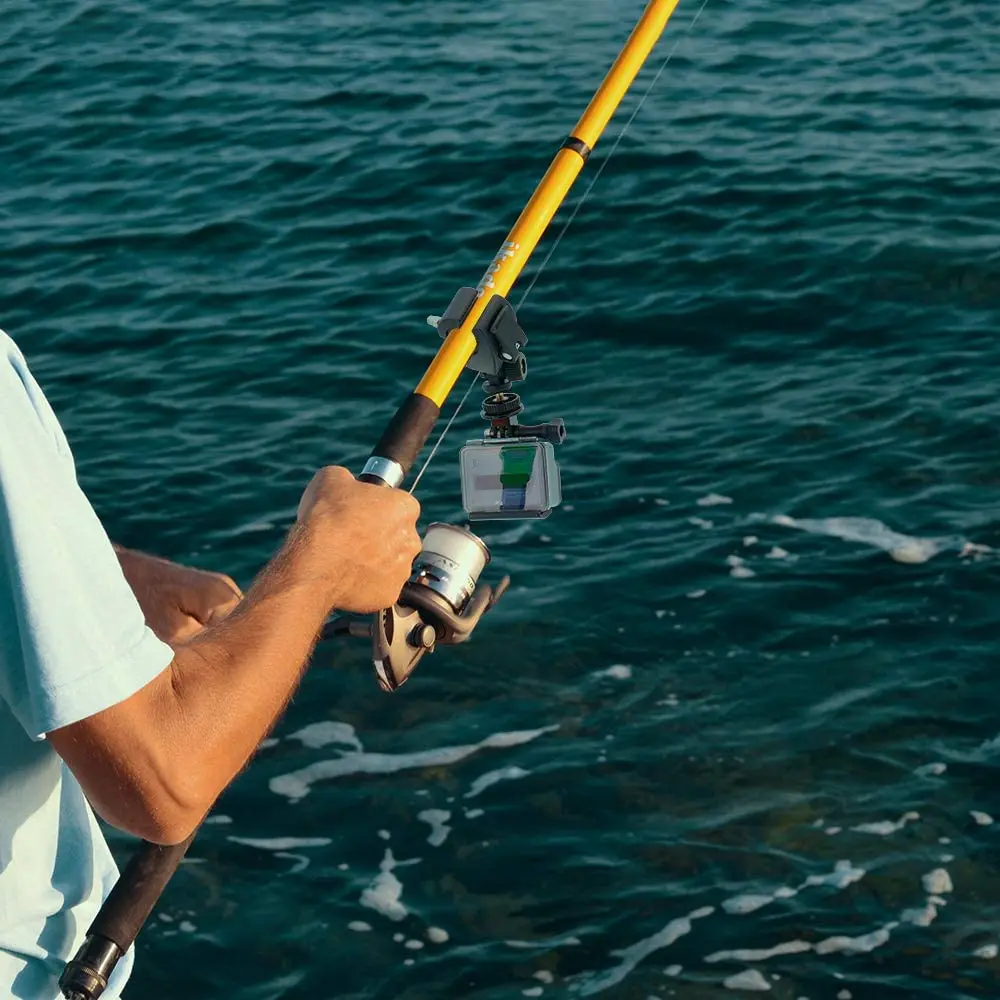 La abrazadera de goma antideslizante Fija tu Cámara de Acción de forma segura a la caña de pescar.