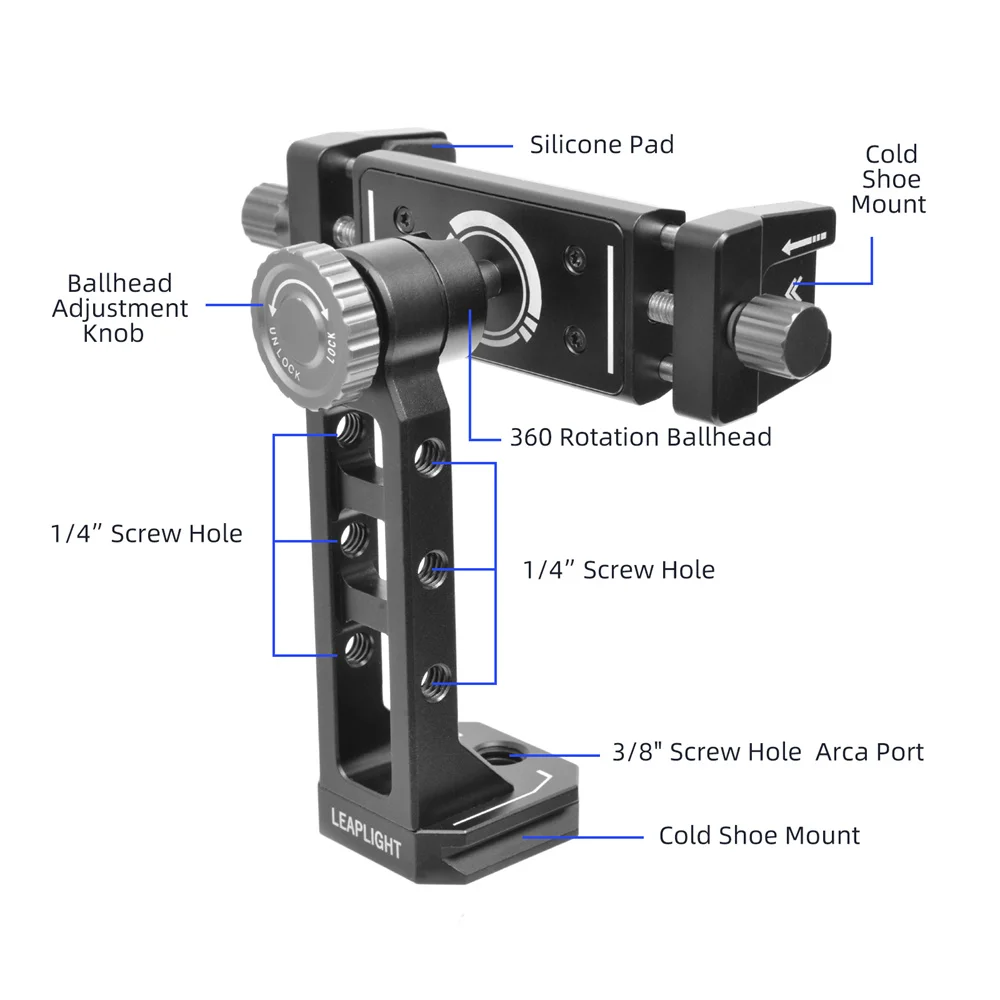 Mejore la fotografía de su teléfono con nuestro versátil 360° ¡Soporte de trípode de metal para teléfono!Con 2 zapatas frías y un puerto Arca, admite la rotación vertical y horizontal para obtener el ángulo perfecto.Con compatibilidad con varios modelos de teléfonos, continúe con cualquier aventura fotográfica con facilidad y precisión.
