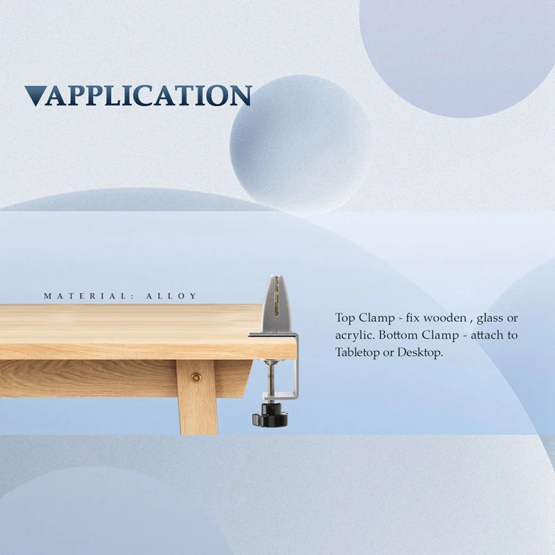 APLICACIÓN: abrazadera superior: fija madera, vidrio o acrílico. Abrazadera inferior: se fija a la mesa o al escritorio.