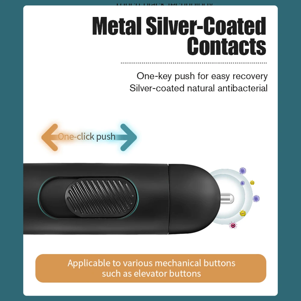El punto de venta definitivo del producto: Este producto utiliza plata metálica como material de contacto. La plata tiene una alta eficiencia y una capacidad antibacteriana de amplio espectro, lo que puede inhibir rápidamente los virus o bacterias que se pegan a los contactos plateados y garantizar la limpieza del producto en sí. La punta del bolígrafo retráctil está libre de contacto, anticontaminación y evita eficazmente el contacto con la propagación del virus. Adecuado para diversos entornos.