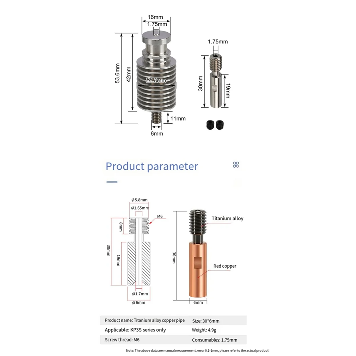 Debido a los diferentes lotes, puede haber diferencias en la apariencia del producto y el texto impreso, lo que no afectará el uso Color: como se muestra Material: aleación de titanio Contenido del paquete: 1 * tubo de calor V6 1 * garganta de aleación de titanio V6 1 * tubo bimetálico V6 Solo el Contenido del paquete anterior, otros productos no están incluidos. Nota: Los reflejos de la luz y las diferentes pantallas pueden hacer que el color del elemento en la imagen sea un poco diferente al real. El error de medición permitido es +/- 1-3 cm.