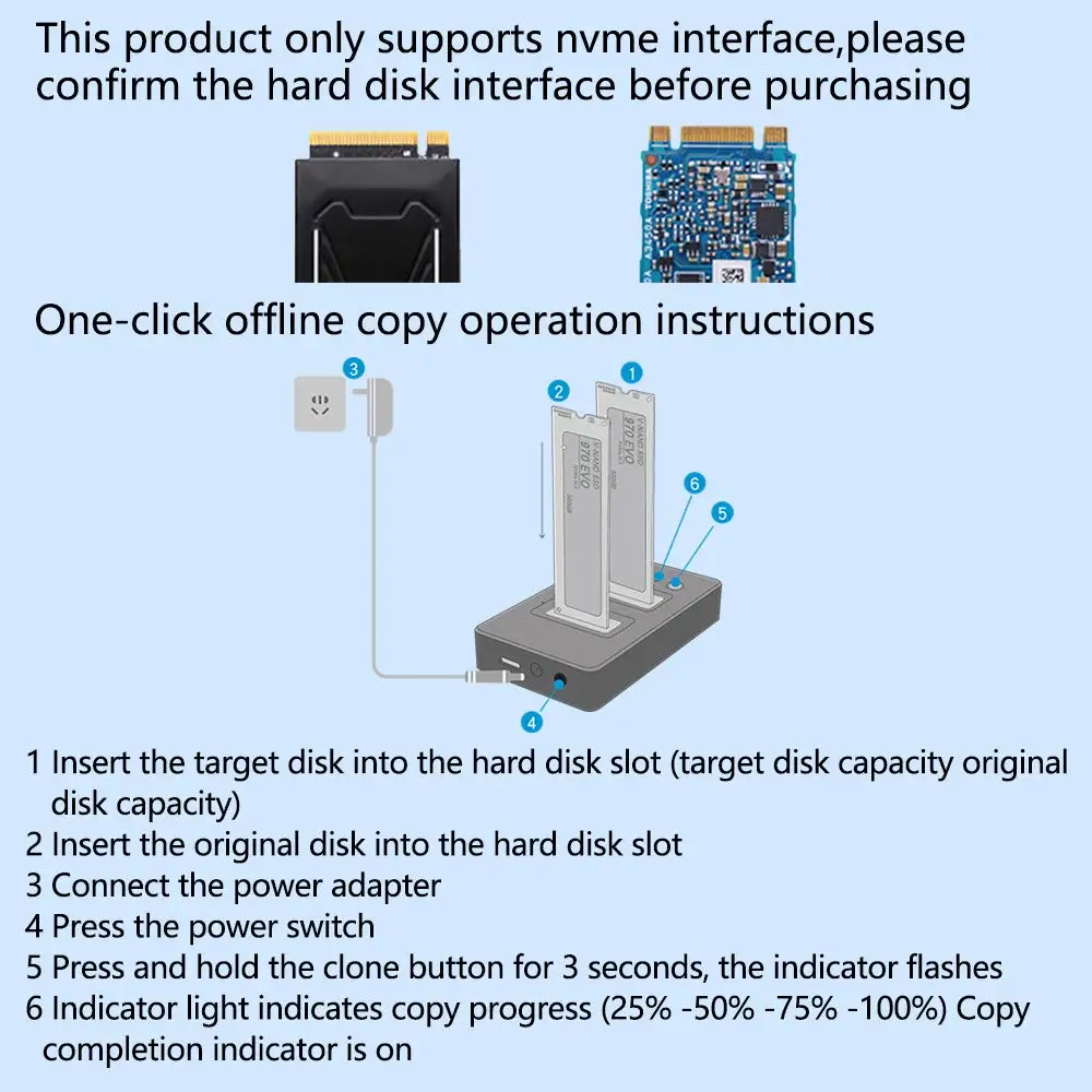 [Easy Offline Cloning]Insert two M2.NVME SSDs, and connect the M.2 duplicator to the power supply only, then long press the Clone button for 3-5 seconds to copy all files from source SSD to target SSD at high speeds up to 10Gbps, with indicators to clearly show the progress status, without requiring acomputer all along.