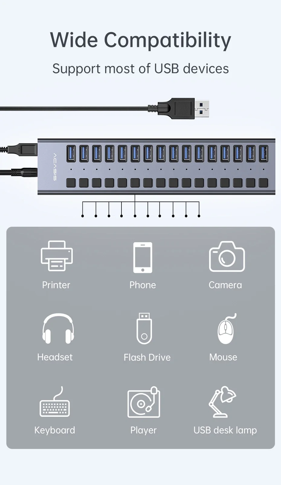Paquete incluido1 * concentrador USB3.11 * Cable USB1 * adaptador de corriente (≥ 120 cm)7-10-13-16 Puertos USB 3.1 HubFuente de alimentación potente, maneja fácilmente el controlador duro 12T Velocidad de transferencia de datos de 5 Gbps