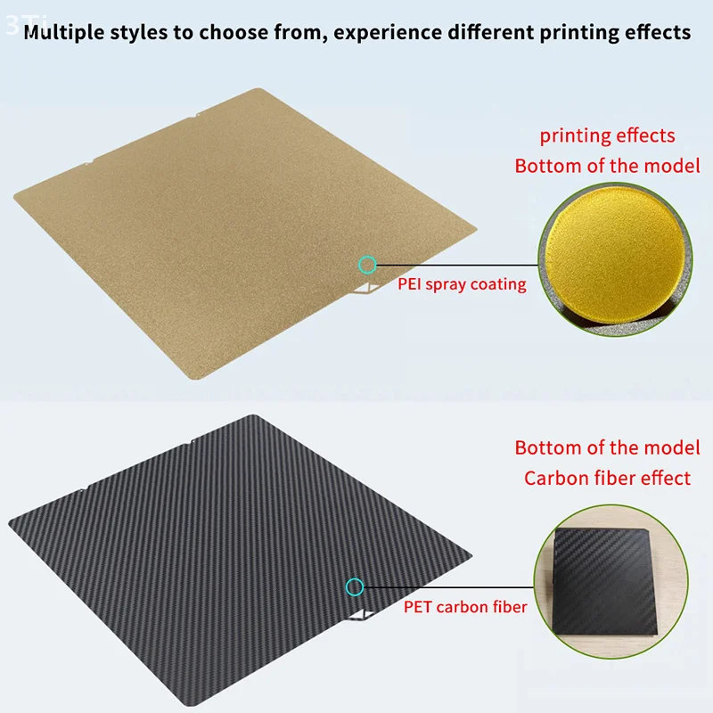 2.Superficie de textura PEI: el uso del diseño de material PEI no solo tiene una excelente resistencia a altas temperaturas, sino que también tiene una buena textura, lo que hace que la impresión sea más fácil de adherir y mayor suavidad.