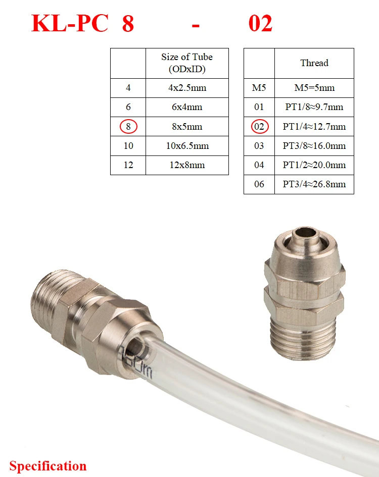Información del producto:OD de 4mm: para tubería OD 4 x ID 2,5OD 6mm: para tubería OD 6 x ID 4OD de 8mm: para tubería OD 8 x ID 5.6,5 de diámetro exterior: para tubería OD 10 x IDOD de 12mm de la KL-PC: para tubería OD 12 x ID 8OD para tuberías de 14mm de diámetro exterior 14 x ID 10.OD para tuberías de 16mm de diámetro exterior 16 x diámetro interior 12.Consejos:Tamaño de la rosca macho: 1/8 ", 1/4", 3/8 ", 1/2" BSP01=1/8 "roscado ≈ 9,7mm02=1/4 "roscado ≈ 12,7mm03=3/8 "roscado ≈ 16mm04=1/2 "roscado ≈ 20mmContenido del paquete1 piezasMontaje rápido