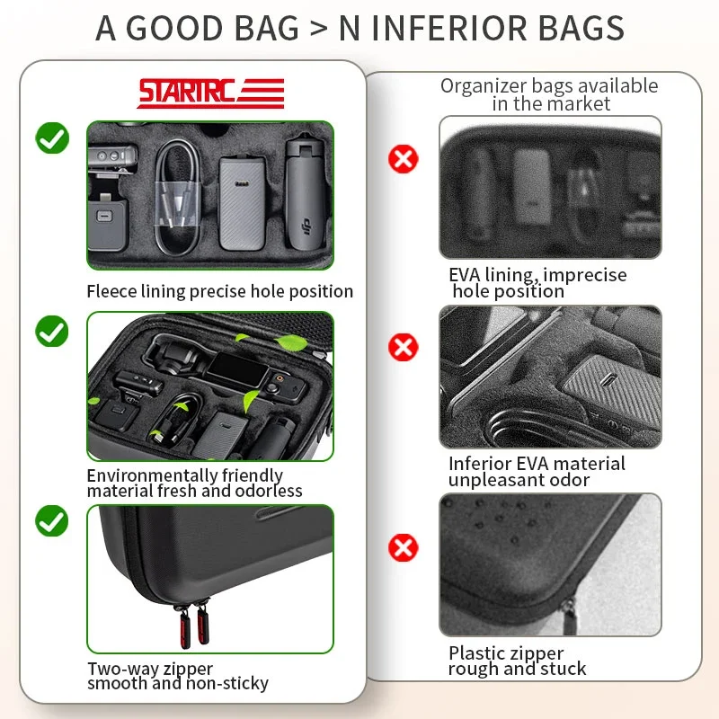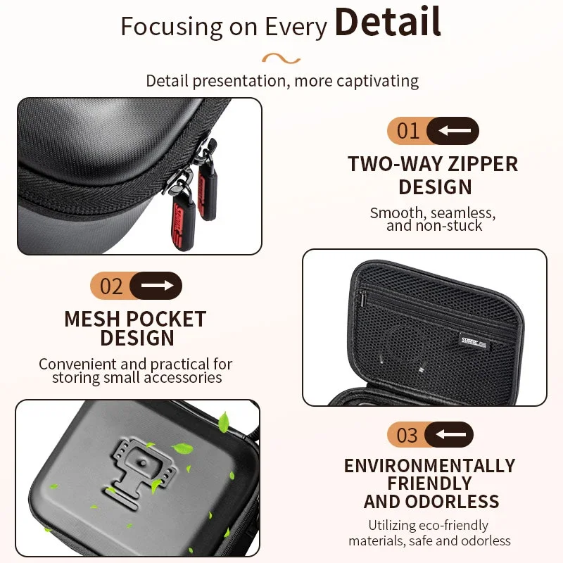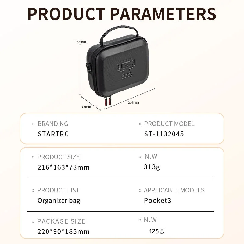 1.Especialmente diseñada para la cámara DJI Pocket 3, tiene un tamaño pequeño pero gran capacidad, que puede almacenar perfectamente juegos completos, como almacenamiento: cámara Pocket 3 (con funda protectora) + trípode + mango de duración de la batería + mango roscado + micrófono, etc.Y el diseño de la bolsa de malla puede almacenar otros accesorios pequeños como cables de datos, fundas de lana resistentes al viento, tarjetas SD, etc.
