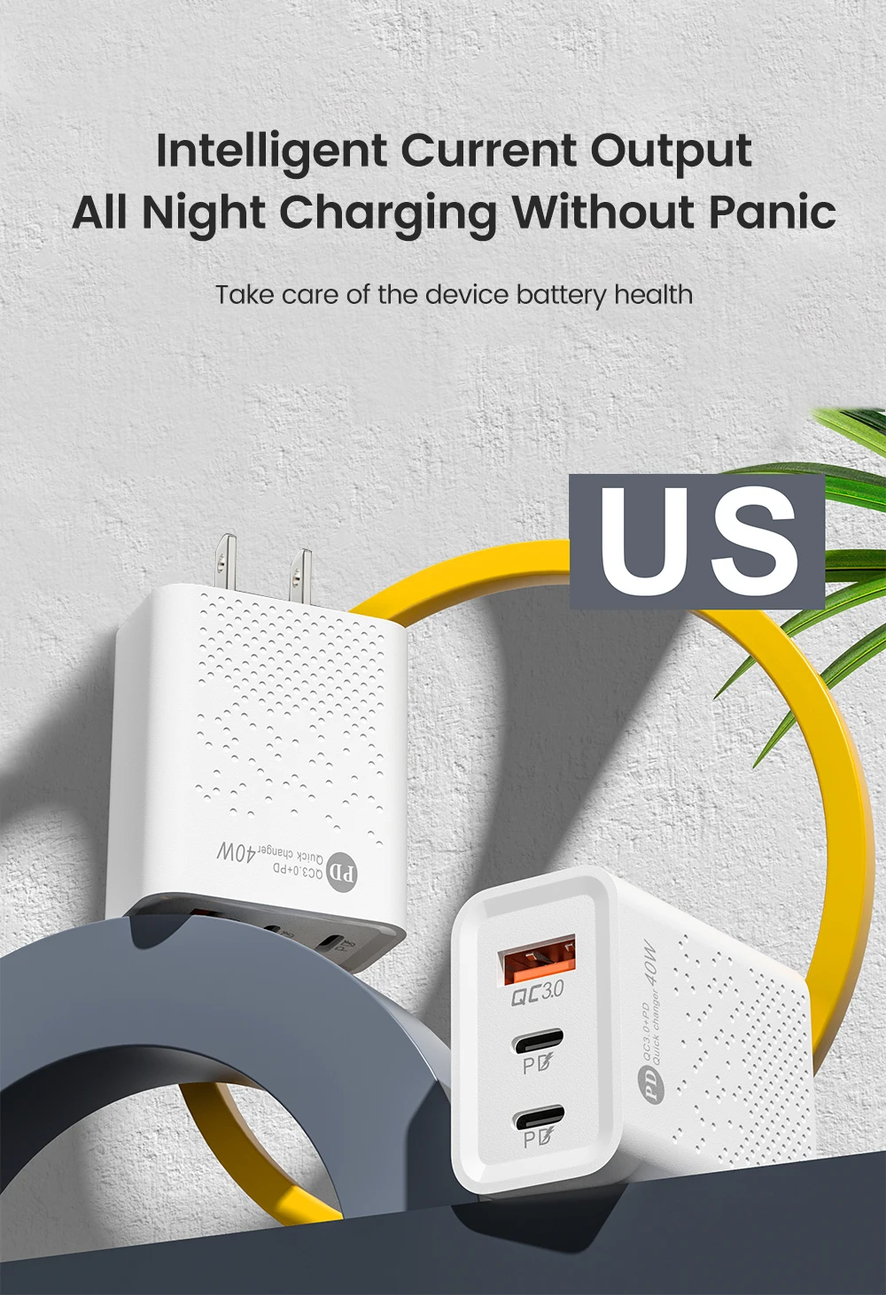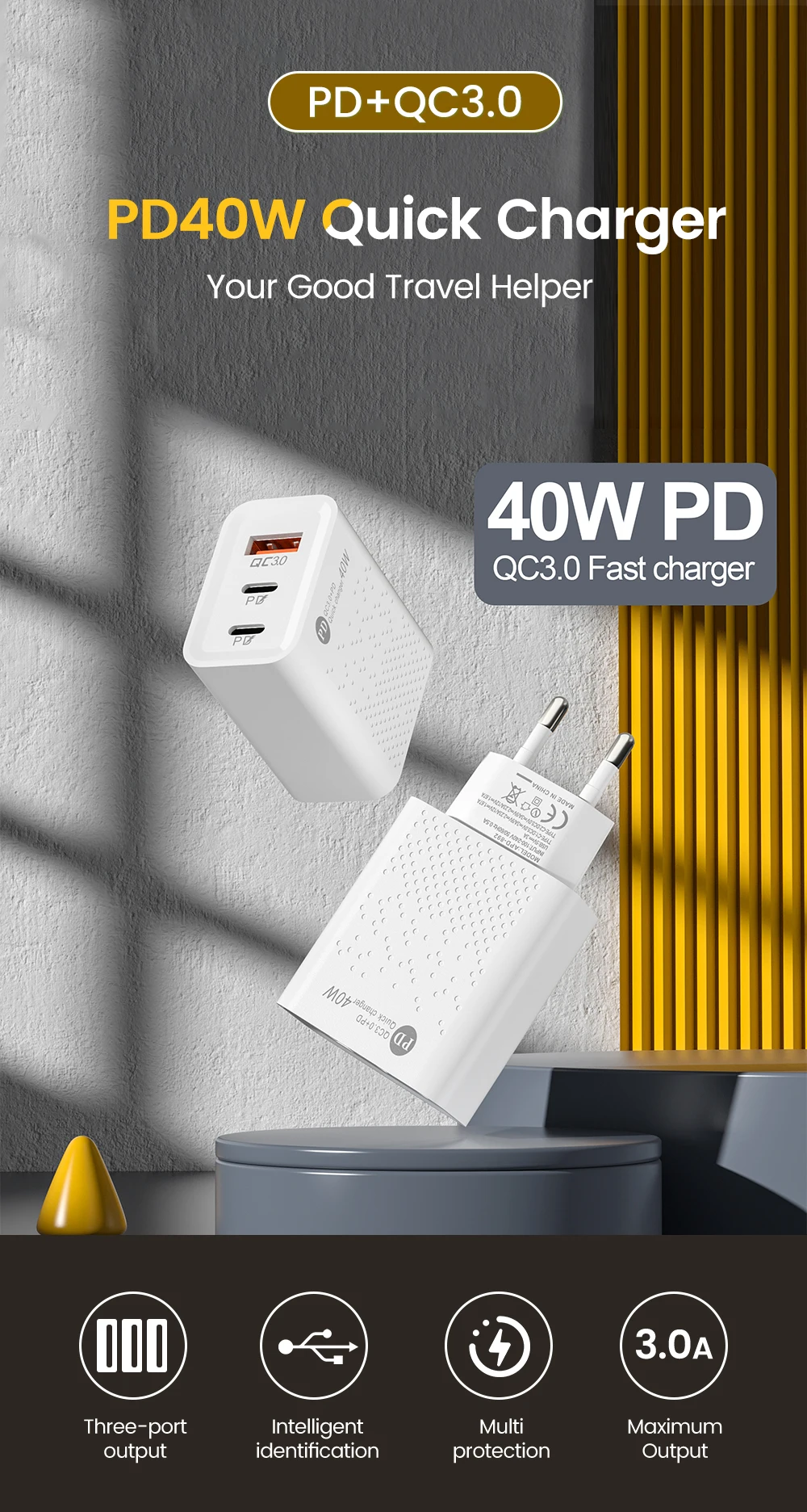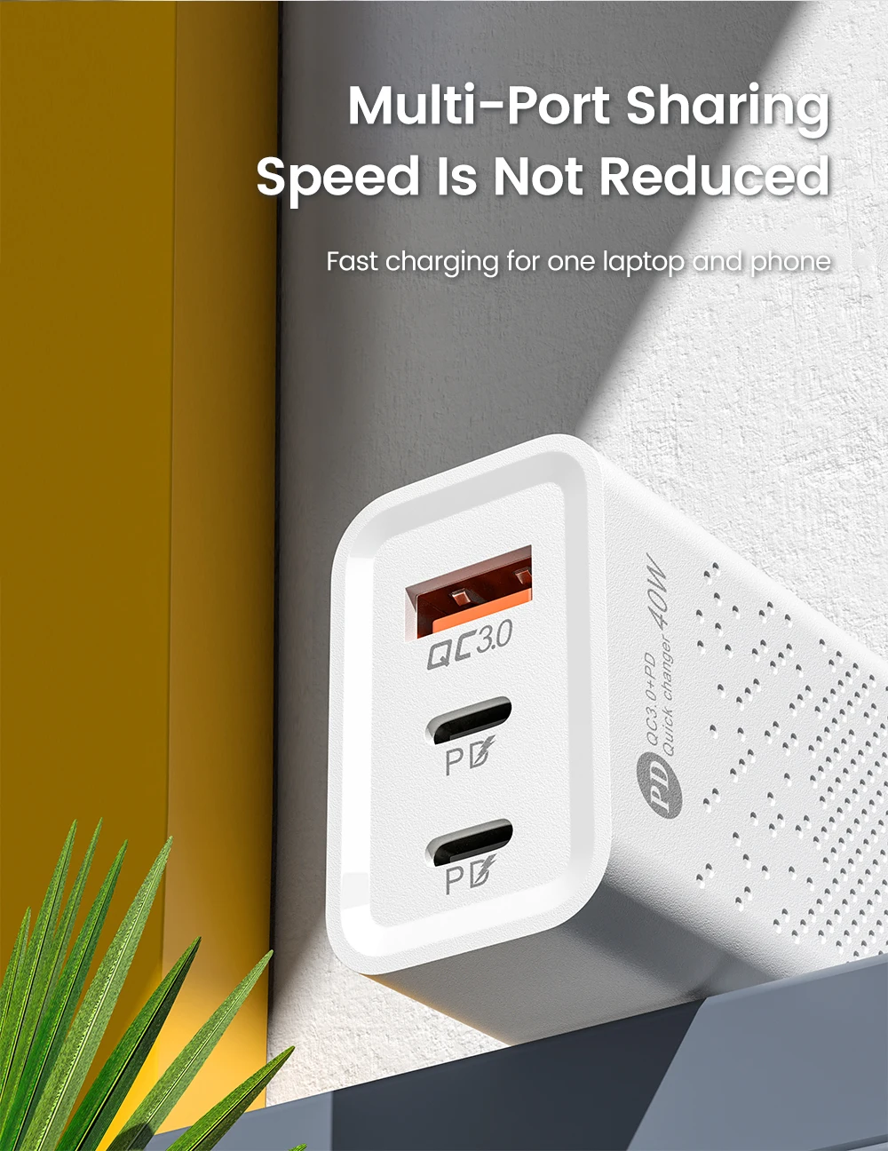 Hola, el "40W" en el cargador significa PD40w en total (el puerto QC3.0 no está incluido), como se muestra en la imagen sobre la prueba de voltaje y corriente. 1 puerto PD puede alcanzar 20W MAX 3 puertos pueden alcanzar 60W MAX en total