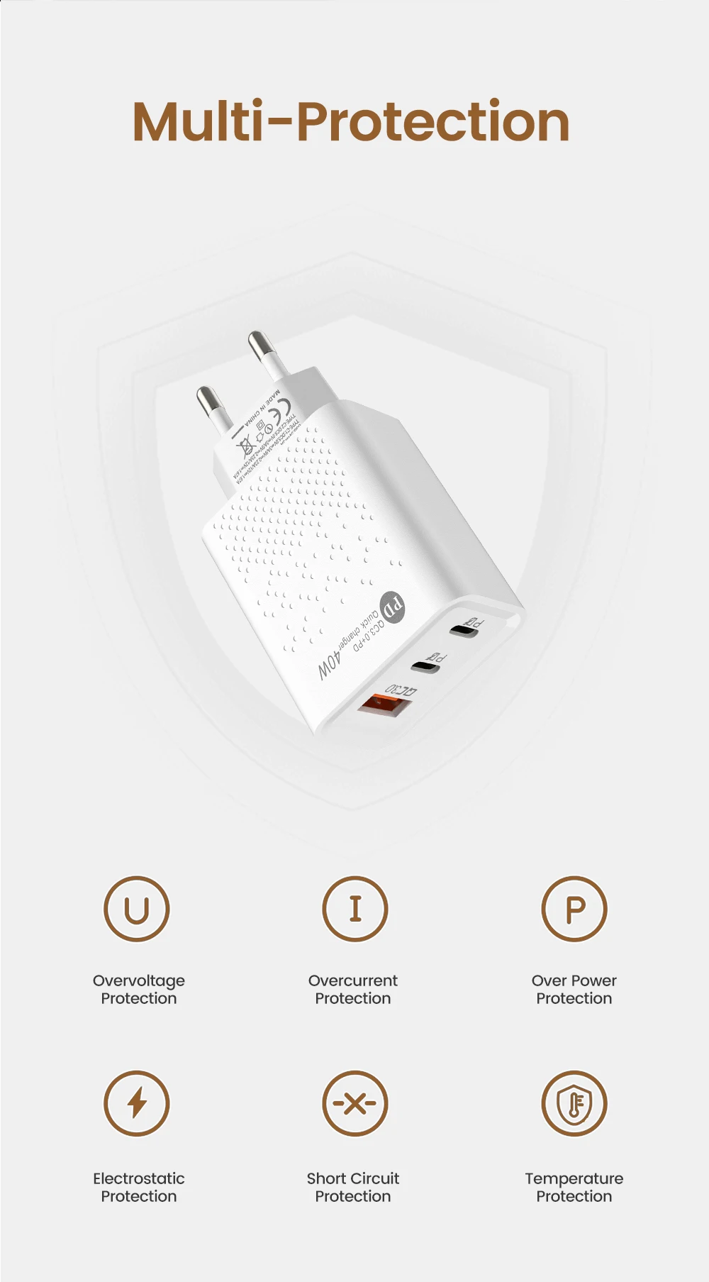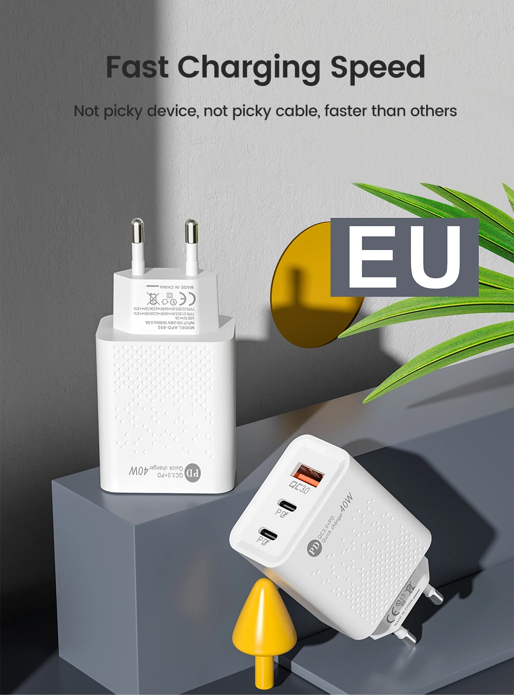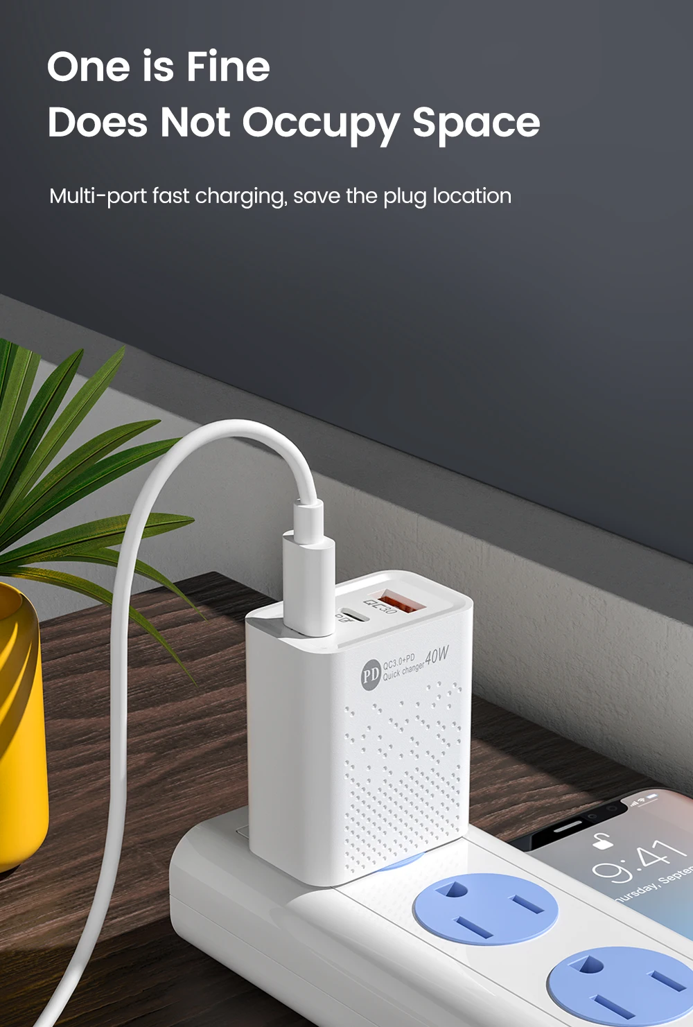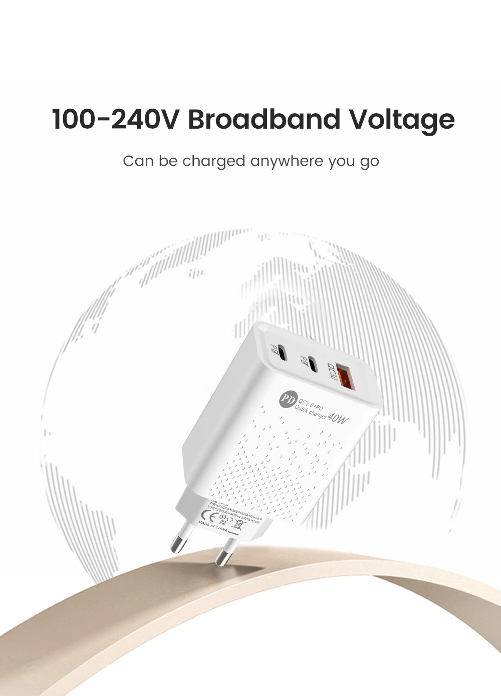 Hola, el "40W" en el cargador significa PD40w en total (el puerto QC3.0 no está incluido), como se muestra en la imagen sobre la prueba de voltaje y corriente. 1 puerto PD puede alcanzar 20W MAX 3 puertos pueden alcanzar 60W MAX en total