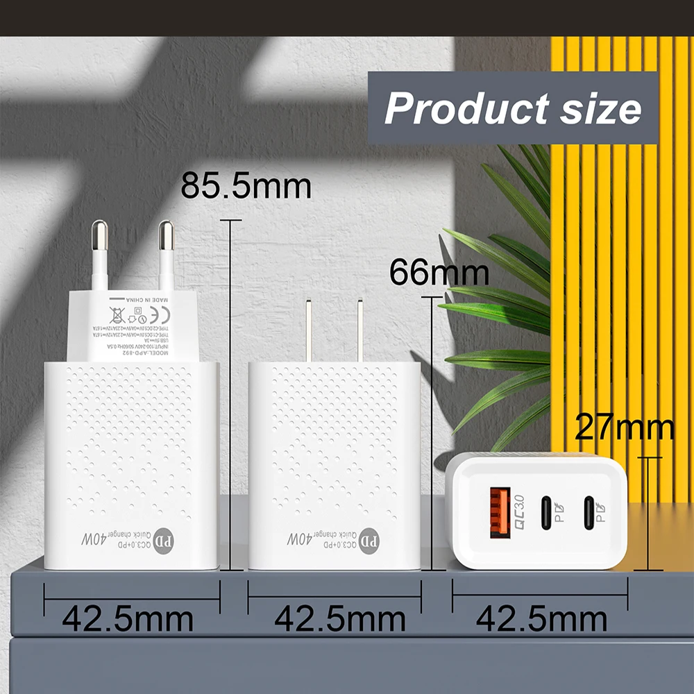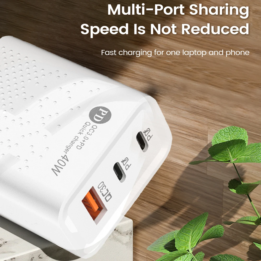 Hola, el "40W" en el cargador significa PD40w en total (el puerto QC3.0 no está incluido), como se muestra en la imagen sobre la prueba de voltaje y corriente. 1 puerto PD puede alcanzar 20W MAX 3 puertos pueden alcanzar 60W MAX en total