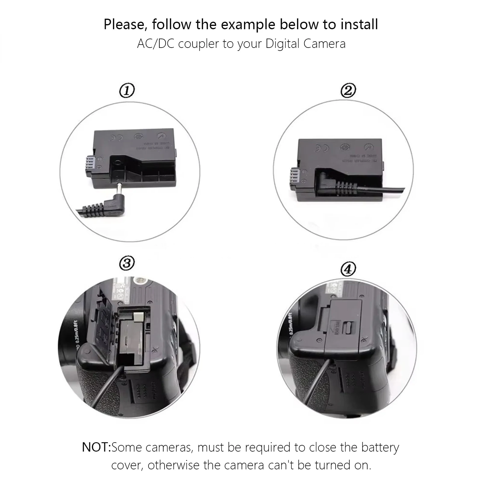 Compatible con los siguientes modelos de cámaras Canon:Canon EOS Rebel SL1Canon 100DCanon Kiss X7Cámaras Canon PowerShot SX70 HS DSLR.Especificación del producto:Potencia nominal: 33,6 WEntrada: 100V-240V-50/60HzSalida: CC 8,4 V/4 A.Certificado de seguridad:Certificado CE, FCC, UL, CCC, etc.NOTA: Los acopladores de CC pueden implementar todas las funciones originales, pero nuestro acoplador de CC no se puede usar solo,Necesita equipar el adaptador AC/DC de este kit para que funcione bien con sus cámaras.Kit de adaptador de corriente CA continua ACK-E15:1. Este kit logra un adaptador de corriente CA de repuesto y está diseñado para suministrar energía ininterrumpida para su cámara mientrasdescargar imágenes a su computadora, para trabajar ampliadamente en un estudio,o mientras visualiza imágenes mientras está conectado a su PC, TV o videograbador.2. Este dispositivo proporcionará energía constante a su cámara (no cargará baterías)DEBE asegurarse de que la tapa de la puerta de la batería esté completamente cerrada para que este dispositivo funcione.Lista de paquetes:1 adaptador de CA ACK-E15.1 cable de alimentación de CA para UE o EE. UU.1 batería simulada DR-E15