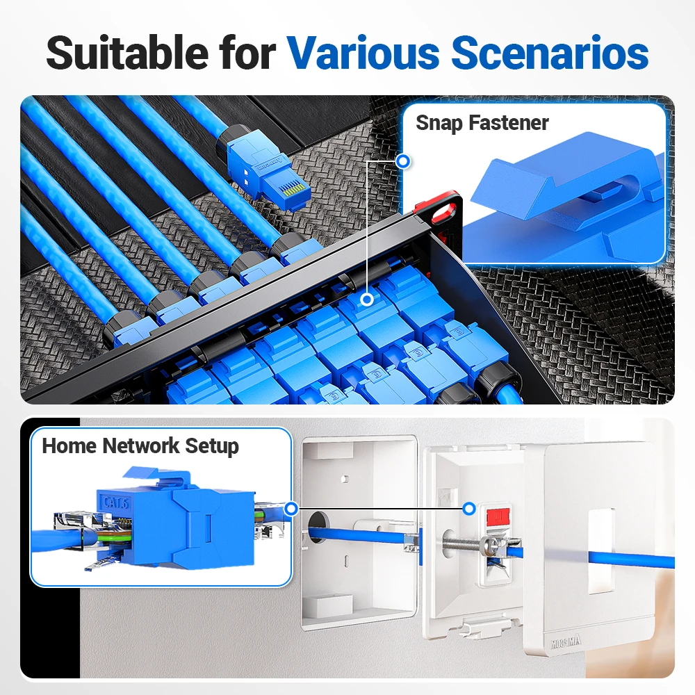 •Los acopladores Keystone Snap-in Cat6/5E brindan una gama completa de soluciones para voz, redes domésticas, oficinas en casa, audio, video y más.Funciona con cualquier placa de pared y paneles de conexión en blanco.