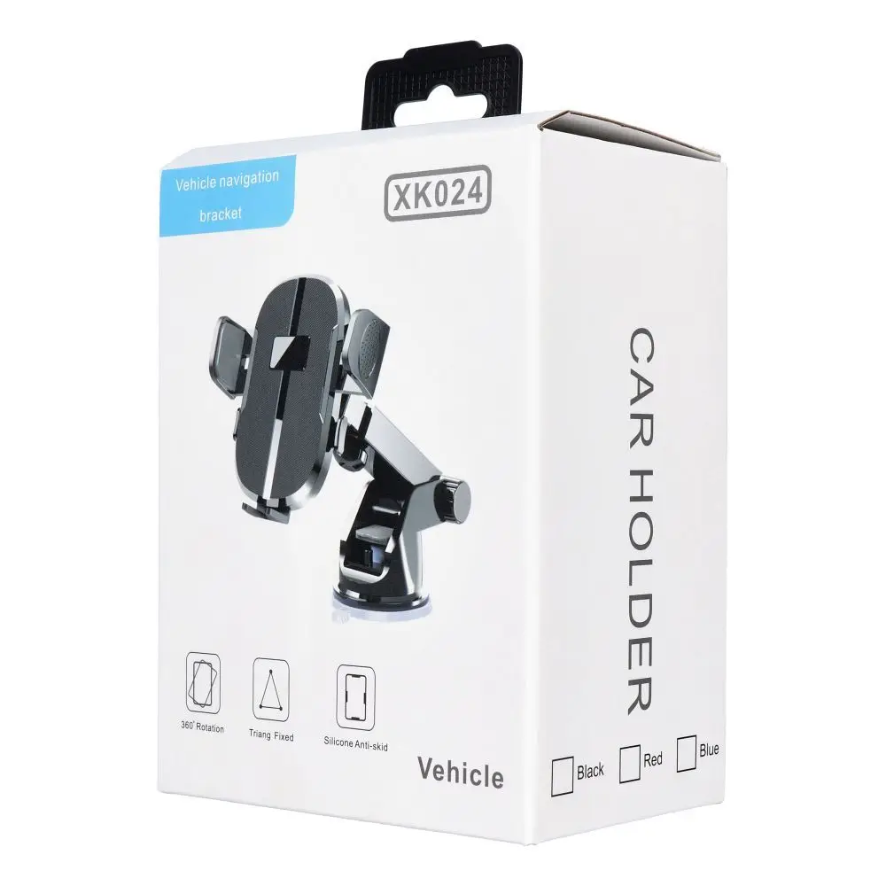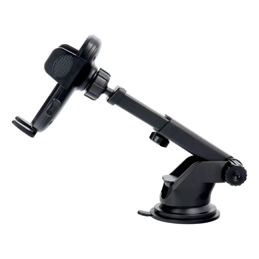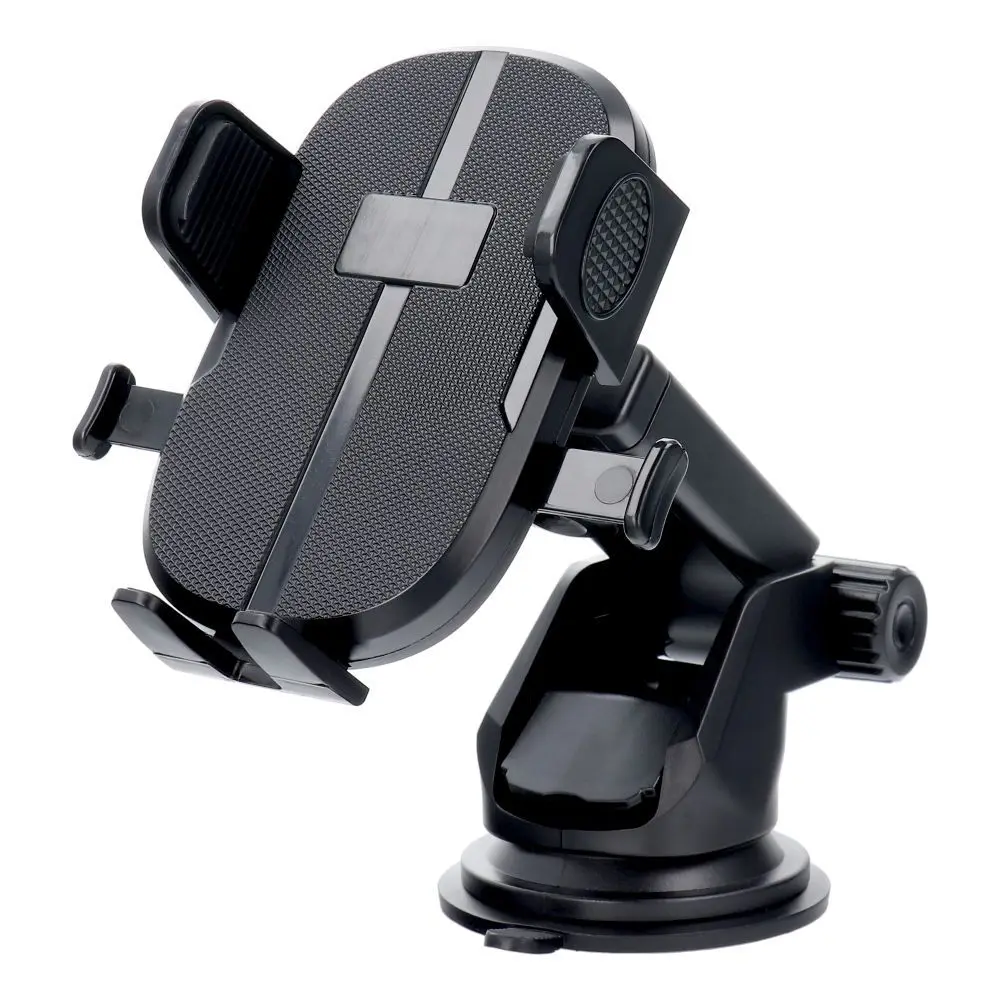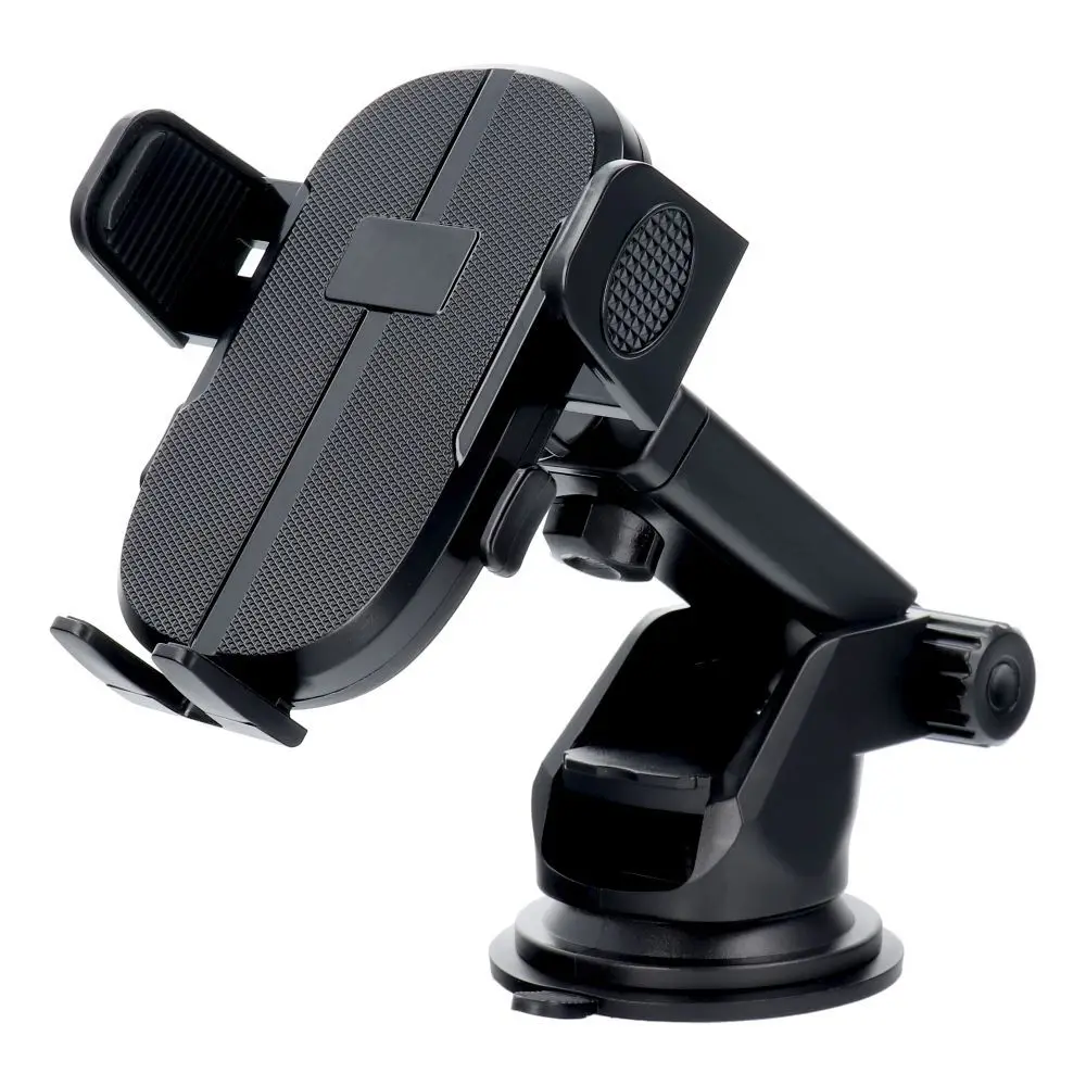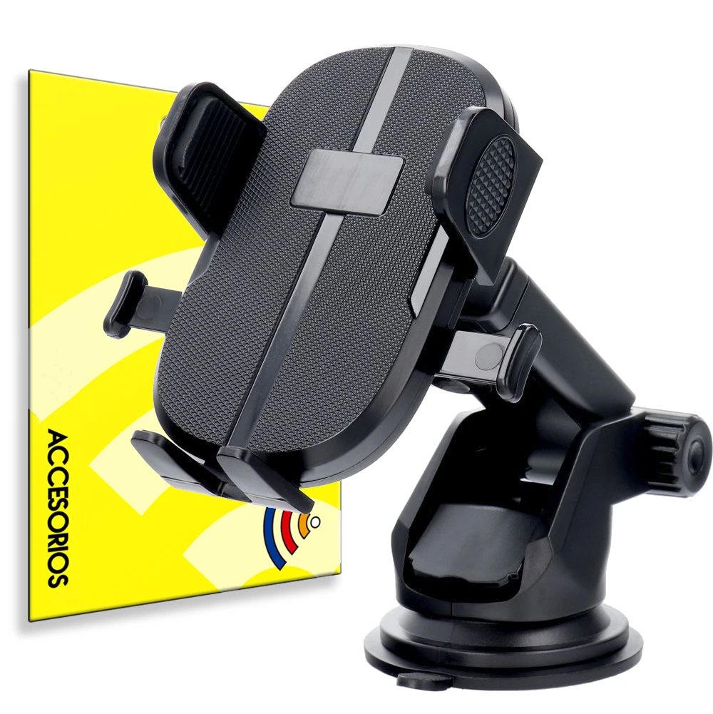 Un soporte universal para coche montado en el parabrisas o salpicadero con un diseño moderno. Tiene un brazo ajustable.