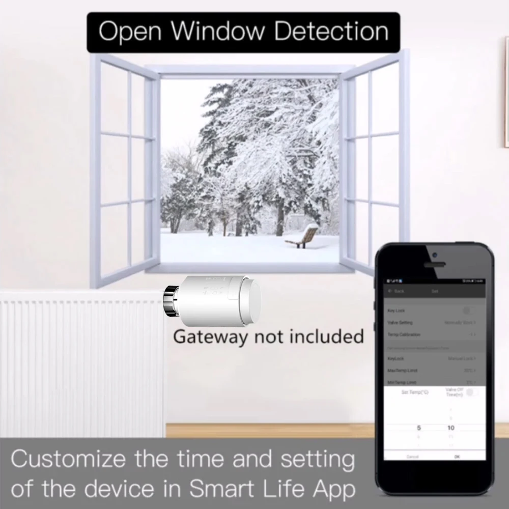 3. Detección de ventana abierta: cuando la temperatura ambiente cae repentinamente. Umbral, la válvula se cerrará durante 15 minutos. Después de eso, si la temperatura ambiente. Sigue siendo inferior a la temperatura. Umbral, mantendrá este modo. Además, es fácil leer la pantalla digital con la temperatura Celsius.