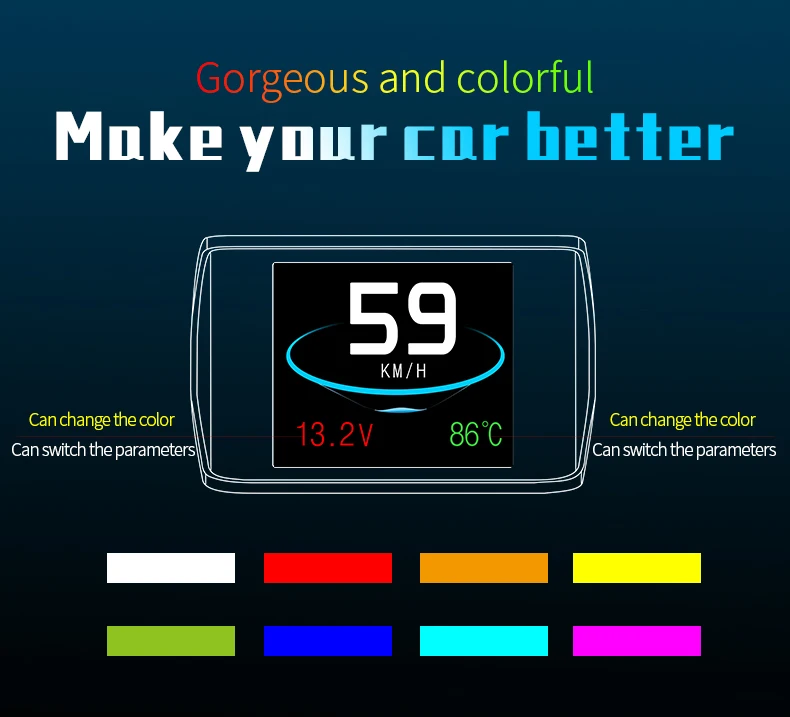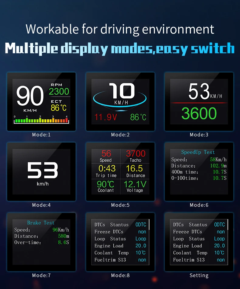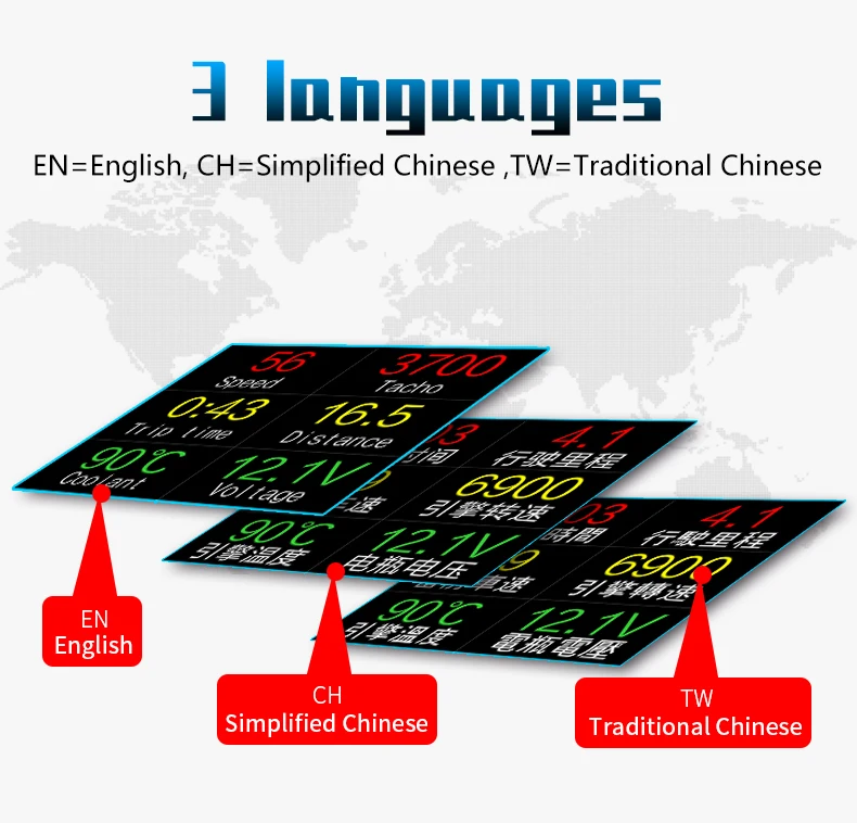 7. Contenido rico: velocidad del vehículo, RPM del motor, temperatura del agua, voltaje, consumo instantáneo de combustible, consumo promedio de combustible, medición de distancia de conducción, tiempo de conducción, alarma de baja tensión, alarma de alta temperatura del agua, sobre la alarma de la velocidad, alarma del Código de avería del motor, elimine el código de avería, cambie libremente entre los kilómetros y las millas.