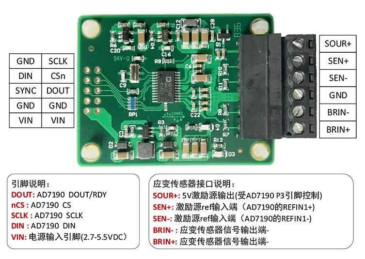 Módulo completo de adquisición de señal de tensión AD7190La fuente de alimentación única es de 2,57,5 VCC.Cuando la tasa de actualización de datos de 24 bits/4,67-4,8 Ksps es 19,2 sps/Gain=128, el dígito sin parpadeo de entrada típico es de 20 bits.Cuando la ganancia es 128, el rango de entrada es +-39mV..Proporcionar un programa de referencia.