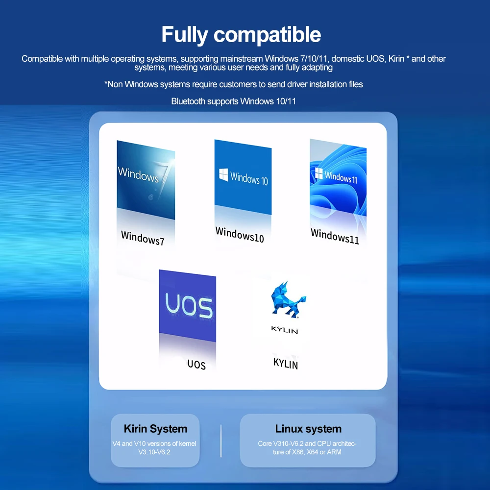 La tarjeta de red inalámbrica de doble banda AX913B+Bluetooth 5.4 es adecuada para la conexión inalámbrica de PC de escritorio y otros dispositivos, lo que puede proporcionar un acceso inalámbrico a Internet cómodo y rápido.La tarjeta de red admite la función de detección automática y puede ajustar automáticamente la velocidad.