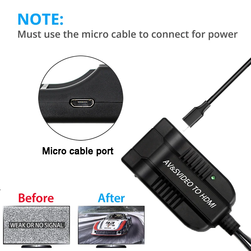 Este convertidor compatible con Mini AV/CVBS/s-video a HDMI es un convertidor universal para entrada compuesta analógica a salida compatible con HDMI 1080P(60Hz)
