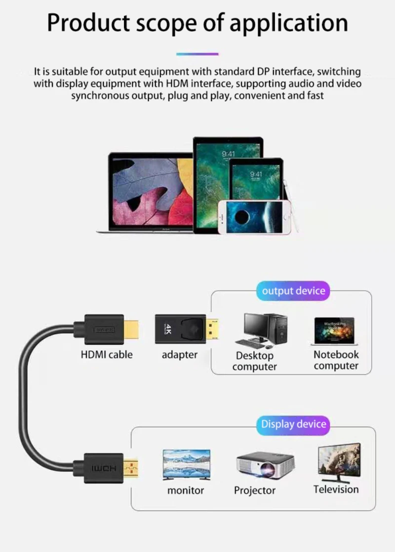 1. Este es un adaptador DP(Display Port) a HDMI (4K/1080P) compatible, se puede utilizar para PC de escritorio/portátil DP a HDTV,Monitor...