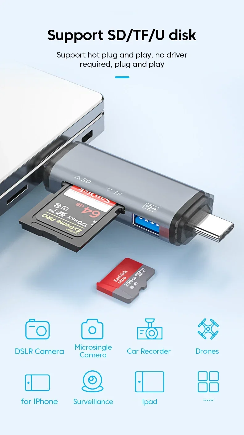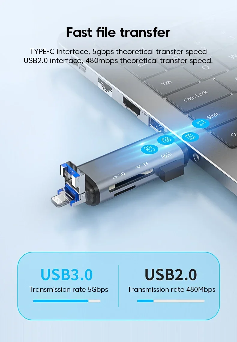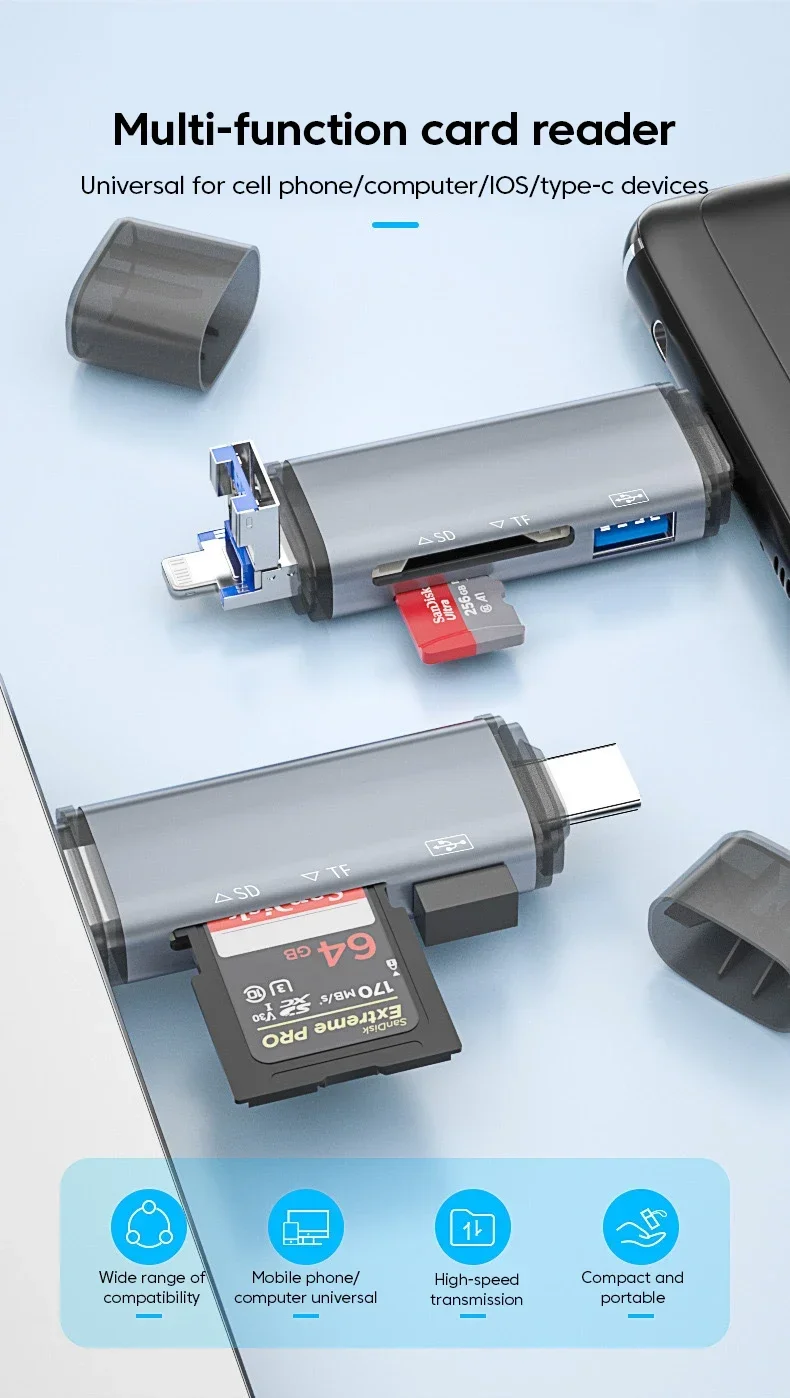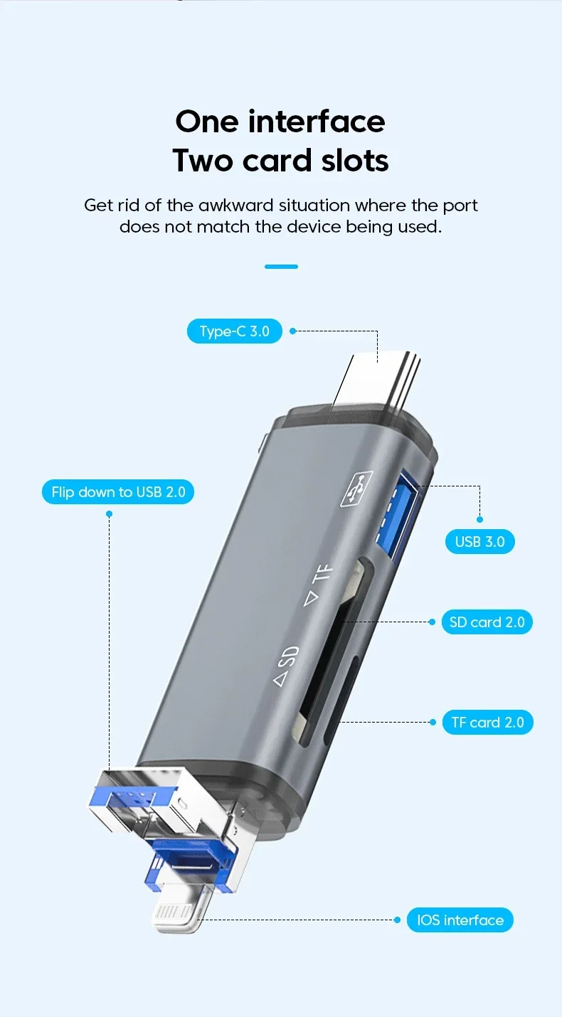 Adaptador 6 en 1 USB A Lightning A tipo C para iPhone, iPad, convertidor de Conector Micro A USB C OTG, lector de tarjetas TF SD