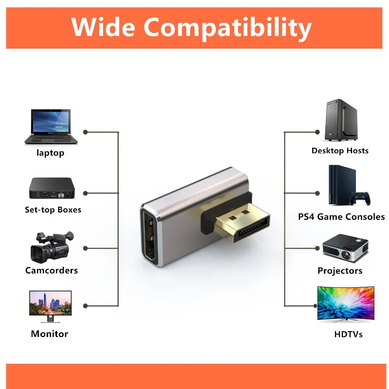 Se puede seleccionar el adaptador DisplayPort de 90 grados y 270 grados para cambiar la dirección de la interfaz para evitar doblar los cables DisplayPort y aliviar la tensión en los puertos DisplayPort. Nuestro conector DisplayPort se adapta a dispositivos montados en la pared, resolviendo la vergüenza de los espacios limitados entre la pared y el dispositivo. (Al mismo tiempo, puede proteger dispositivos hembra como monitores, ordenadores y portátiles para prolongar la vida útil).