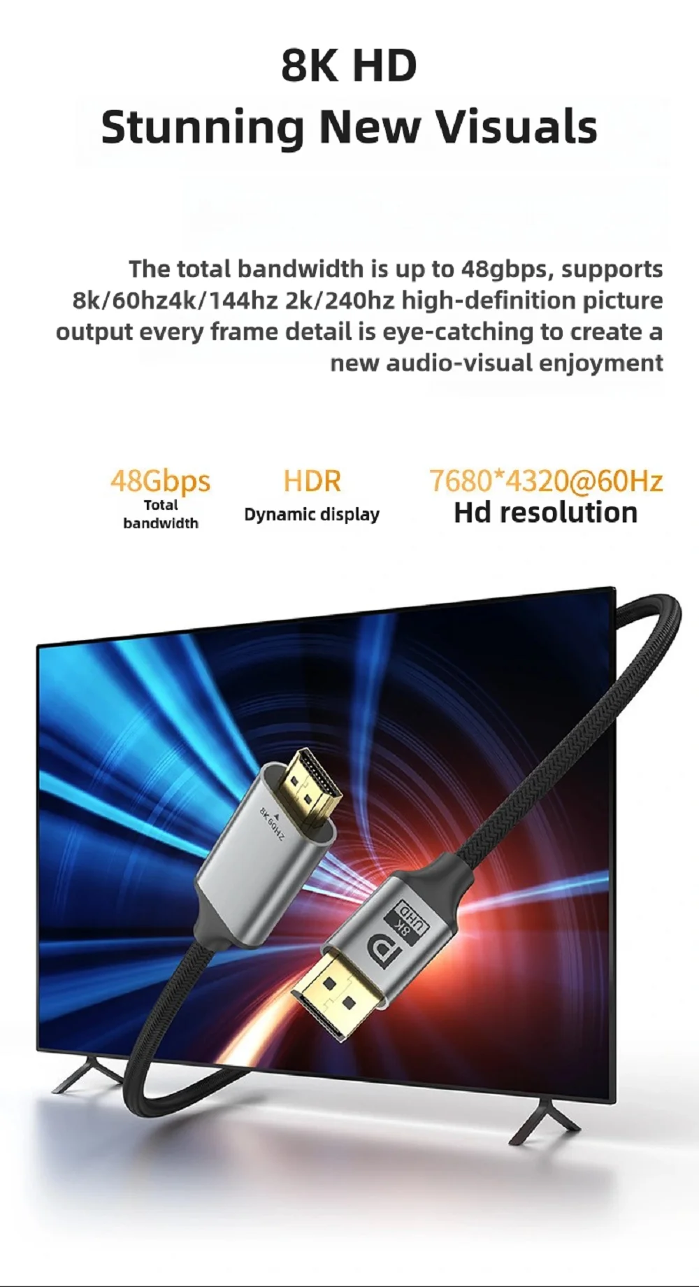 【DisplayPort 1.4 to HDMI-compatible 2.1 Cable】8K DisplayPort to HDMI-compatible cable support high resolution 8K(7680x4320)@60Hz,4K(3840x2160)@120Hz/60Hz,2K( 2560x1440)@144Hz/120Hz,1080p@165Hz/144Hz/120Hz. support Dynamic HDR and DSC 1.2, HDCP 2.3 compliant. backward compatible with DisplayPort 1.3, 1.2, 1.2a, 1.1 and 1.0. support 7.1, 5.1, 2.0 uncompressed Perfect audio passthrough for digital audio channels---( Not compatible with LG C2/CX TV, Not support 240Hz refresh rate)
