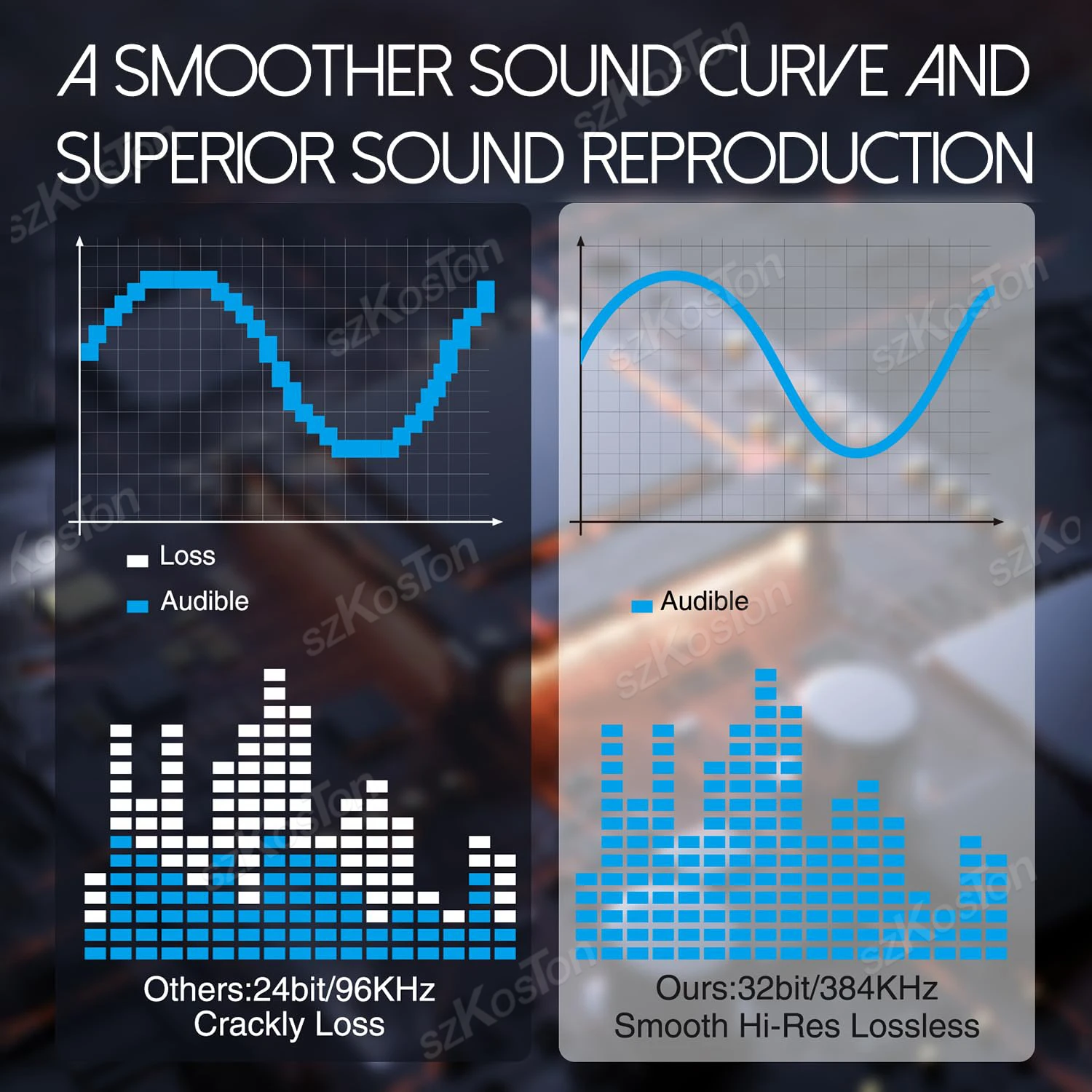 Reproducción sin pérdidas de 32 bits y 384 KHz: redescubra sus pistas favoritas con una calidad impecable.Nuestro adaptador admite reproducción sin pérdidas de 32 bits y 384 KHz, lo que garantiza que cada matiz de la música se reproduzca fielmente.Dile adiós a los artefactos de compresión y disfruta de tu música tal como el artista la creó.