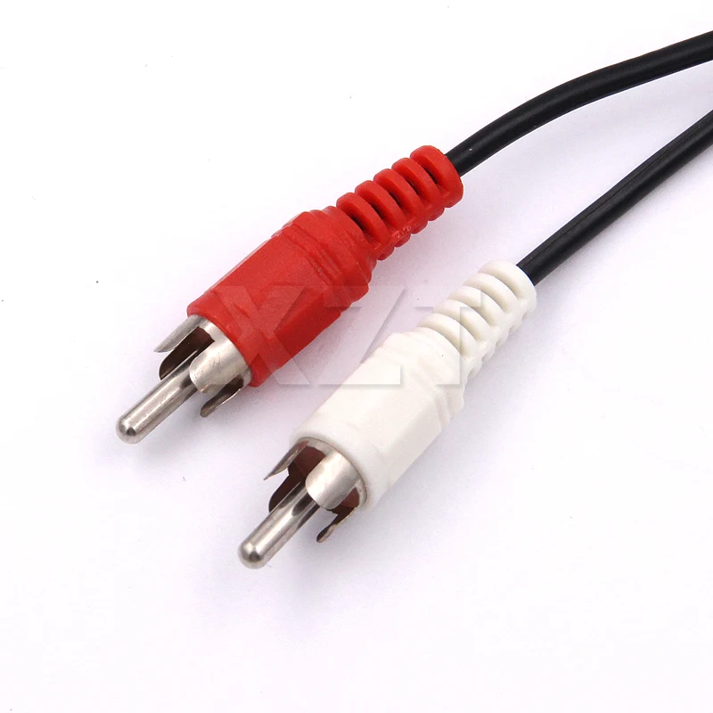 Un extremo del cable tiene un mini conector estéreo hembra de 3,5 mm y el otro extremo tiene dos conectores RCA macho codificados por colores.(canales de audio izquierdo y derecho).