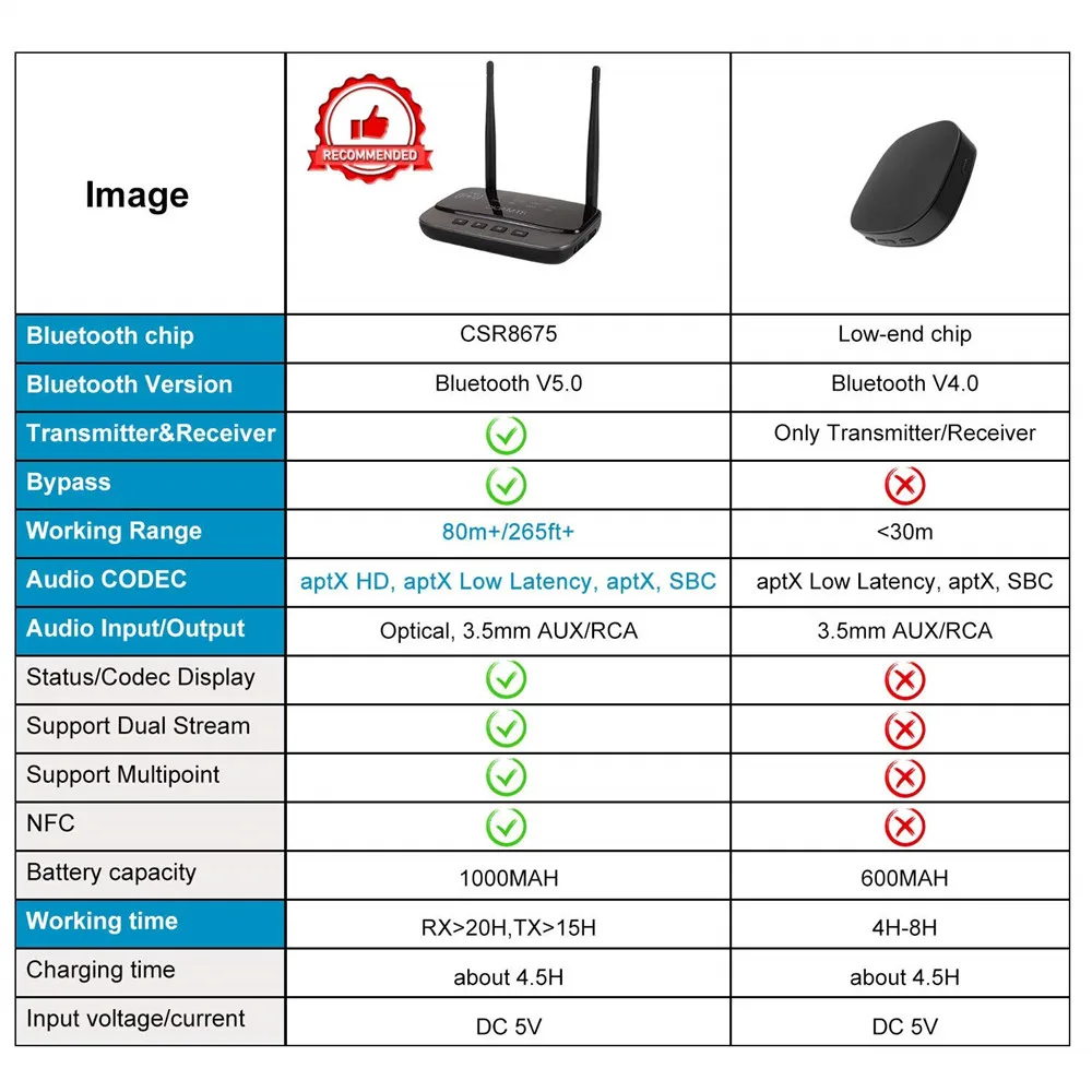 【BLUETOOTH 5,0 HI-FI Aptx HD/LL】Cuenta con la versión más alta de Bluetooth V5.0 y el chip CSR8675 de gama alta para proporcionar la mejor eficiencia de transmisión, estabilidad y consumo de energía ultra bajo. Compatible con AptX HD y AptX Low Latency, con transmisiones de sonido estéreo de calidad de CD de alta fidelidad sin problemas. Es la mejor opción si está buscando un receptor y transmisor de audio Bluetooth rentable.