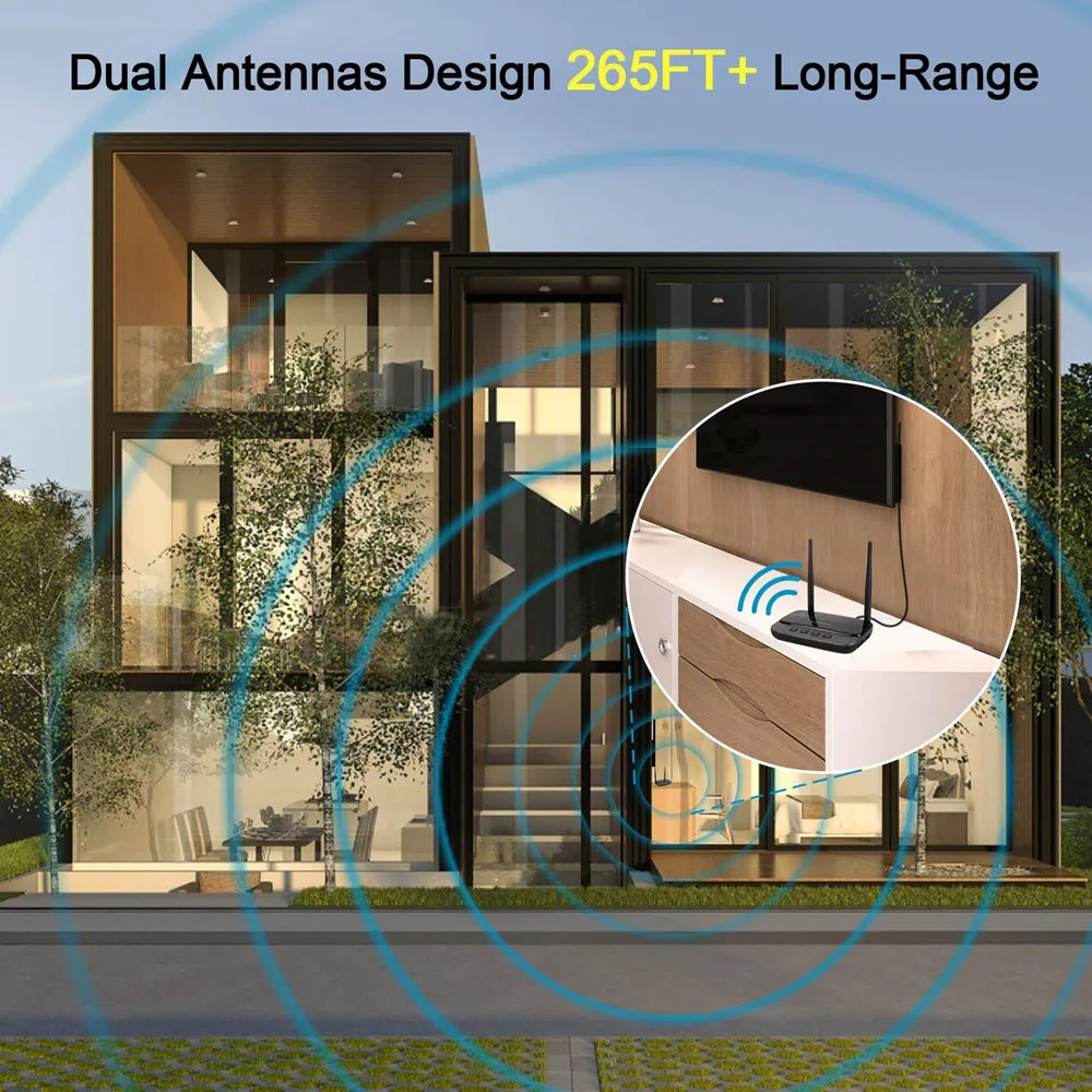 【ANTENAS DOBLES 80m/262 pies LARGO ALCANCE 】En realidad probado en un rango de 265 pies (80m) al aire libre y más de 100 pies (30m) en interiores sin ningún atasco ni retraso. Las antenas duales cuentan con un amplio rango de transmisión y largo, súper estable y potente. El receptor-transmisor BTmagic es perfecto para la conectividad interior-exterior, sin importar dónde están instalados los altavoces o el centro multimedia.