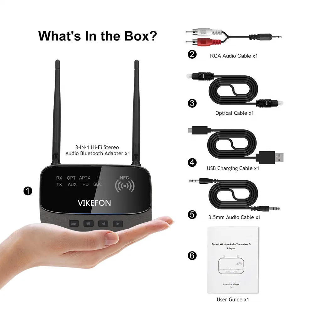 Contenido del paquete1 x adaptador de transmisor/receptor Bluetooth1 x cable de carga Micro USB1 cable de audio de 3,5mm1 Conector de 3,5mm a 2 cables de enchufe RCA1 x Cable de audio Toslink óptico digital1 manual de usuario