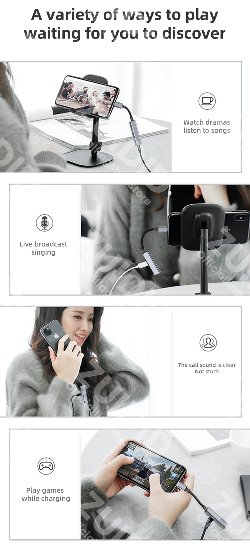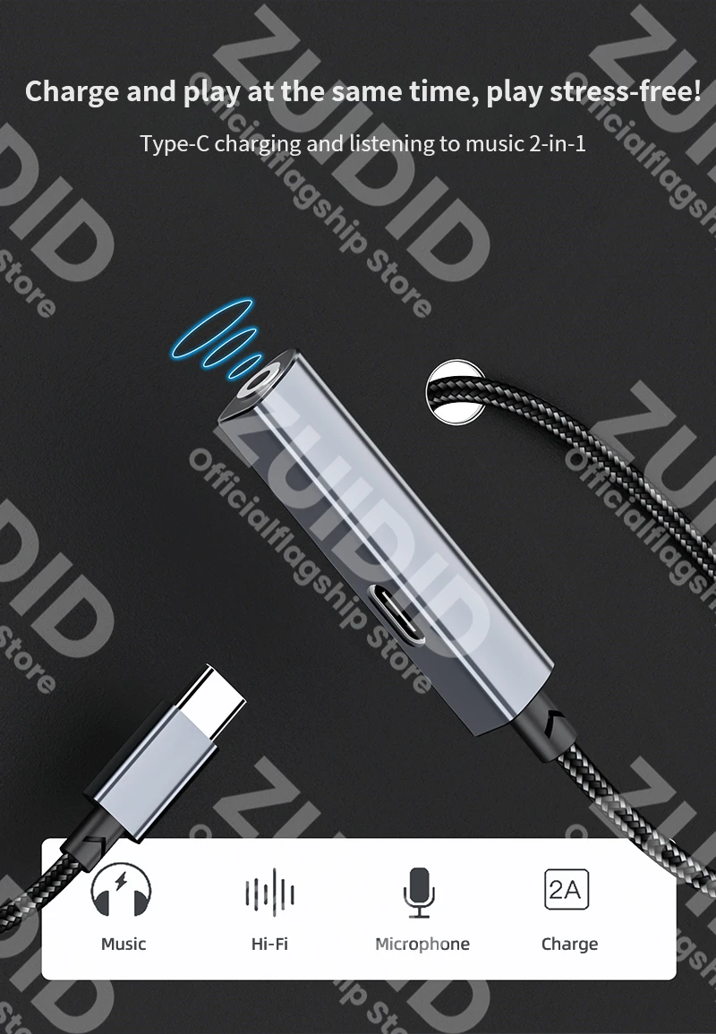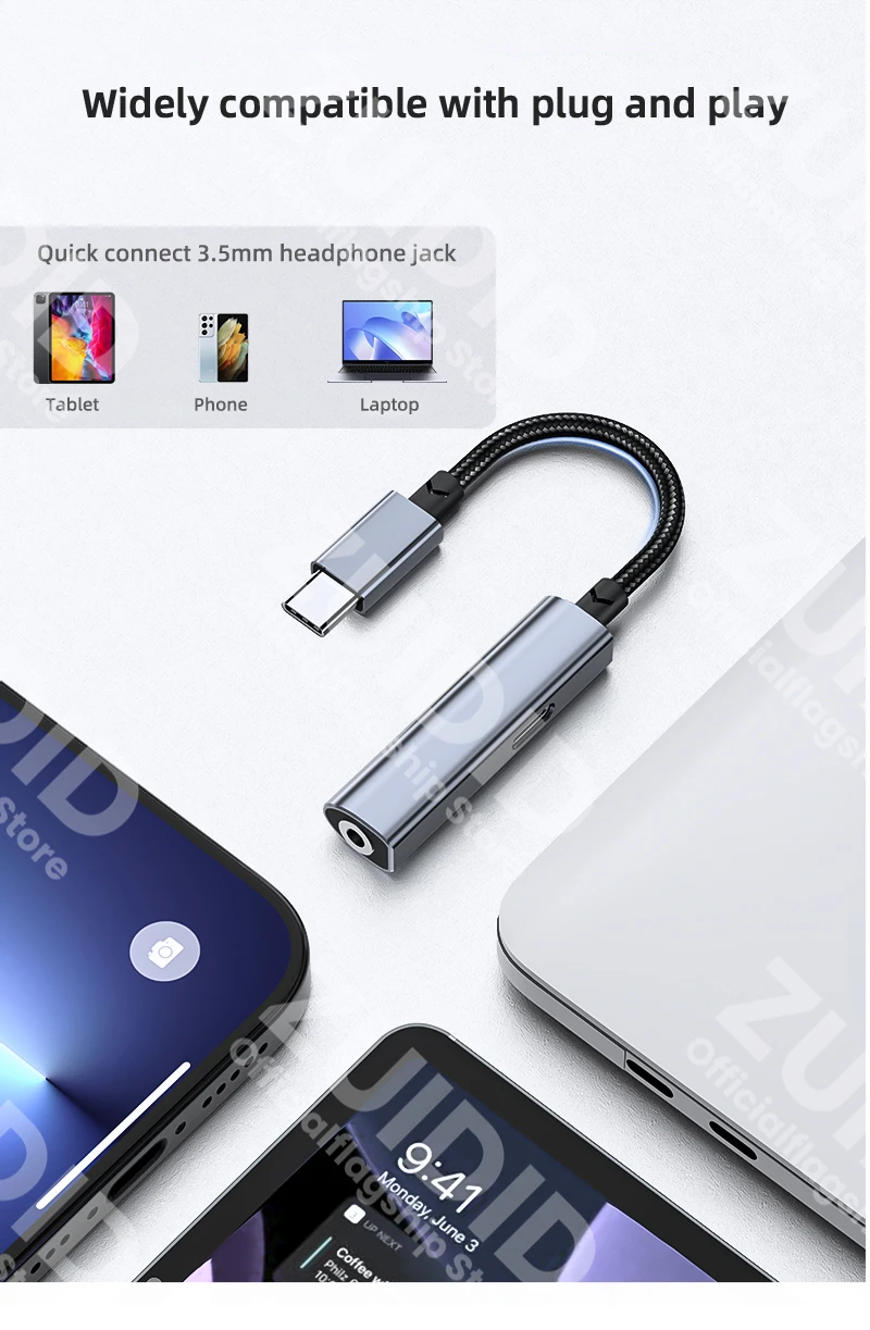 Adaptador de audio auxiliar 2 en 1 USB C a 3,5mm/tipo C 2A de carga rápida 16Bit/48KHz DAC Aux convertidor de auriculares para iPhone 15 iPad Samsung