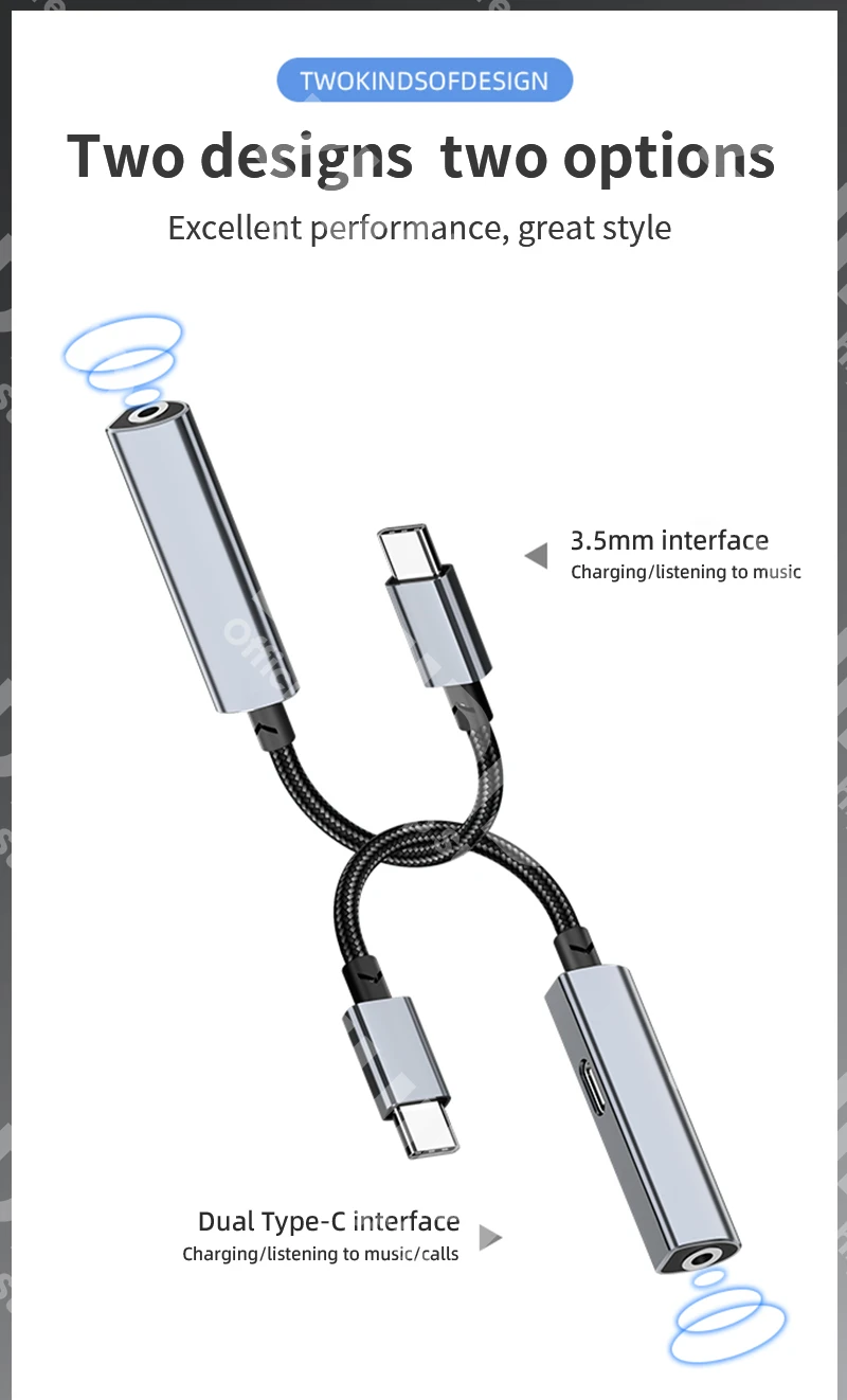 Adaptador de carga y audio USB-C 2 en 1. Funciona bien por su precio. Parece funcionar también con carga turbo/rápida.